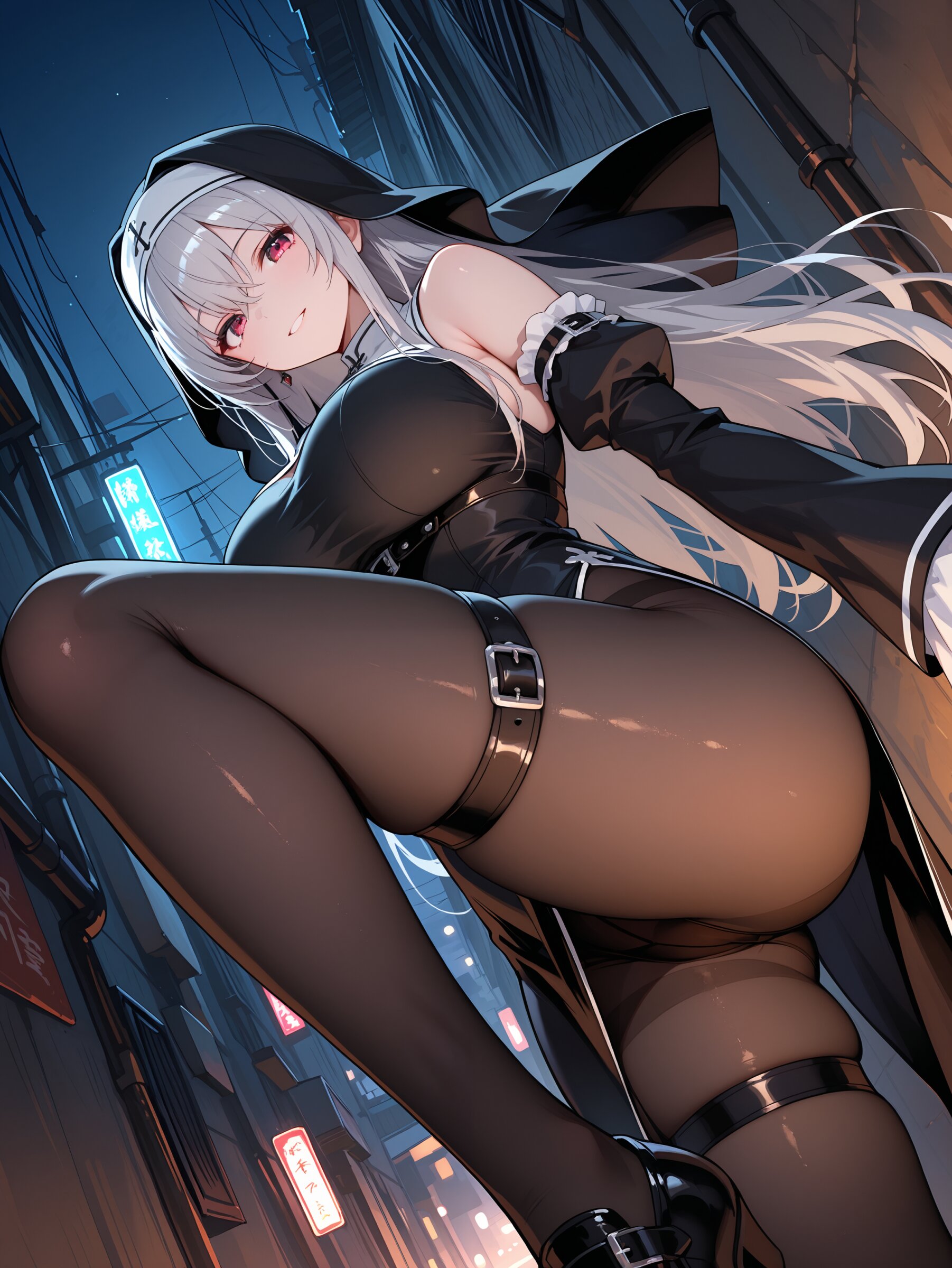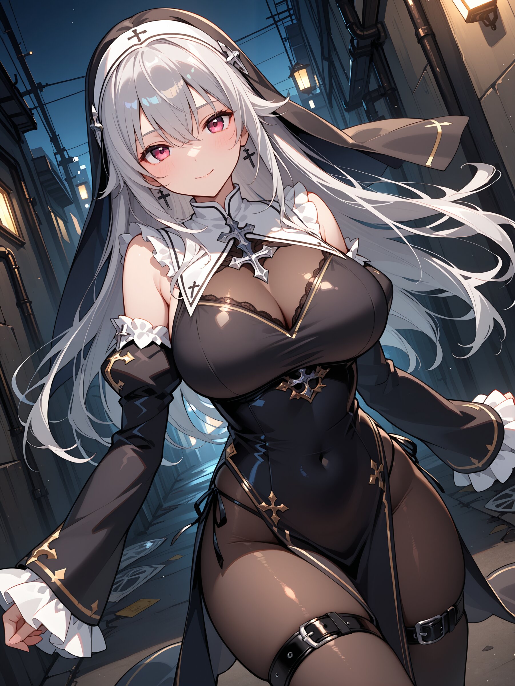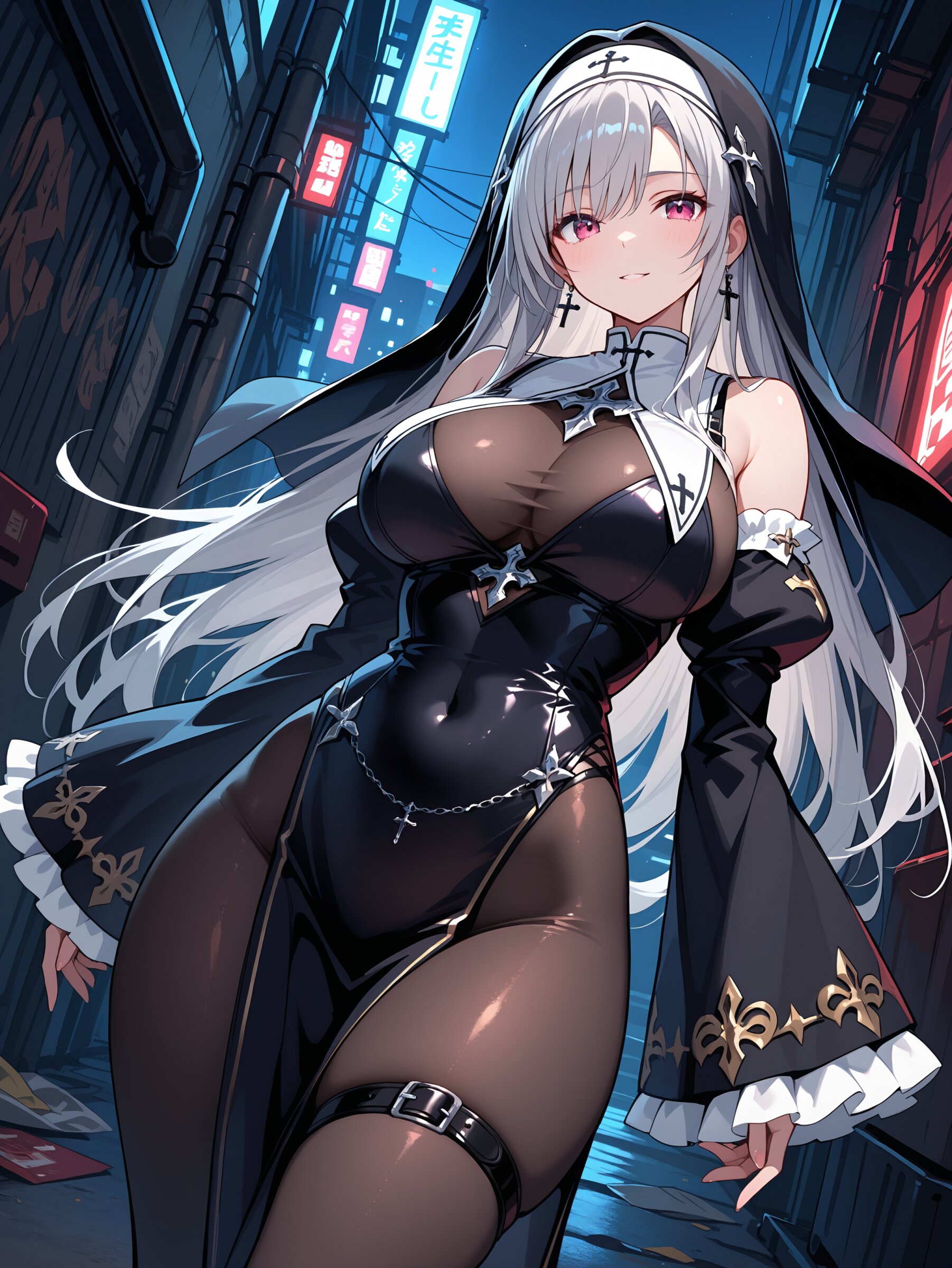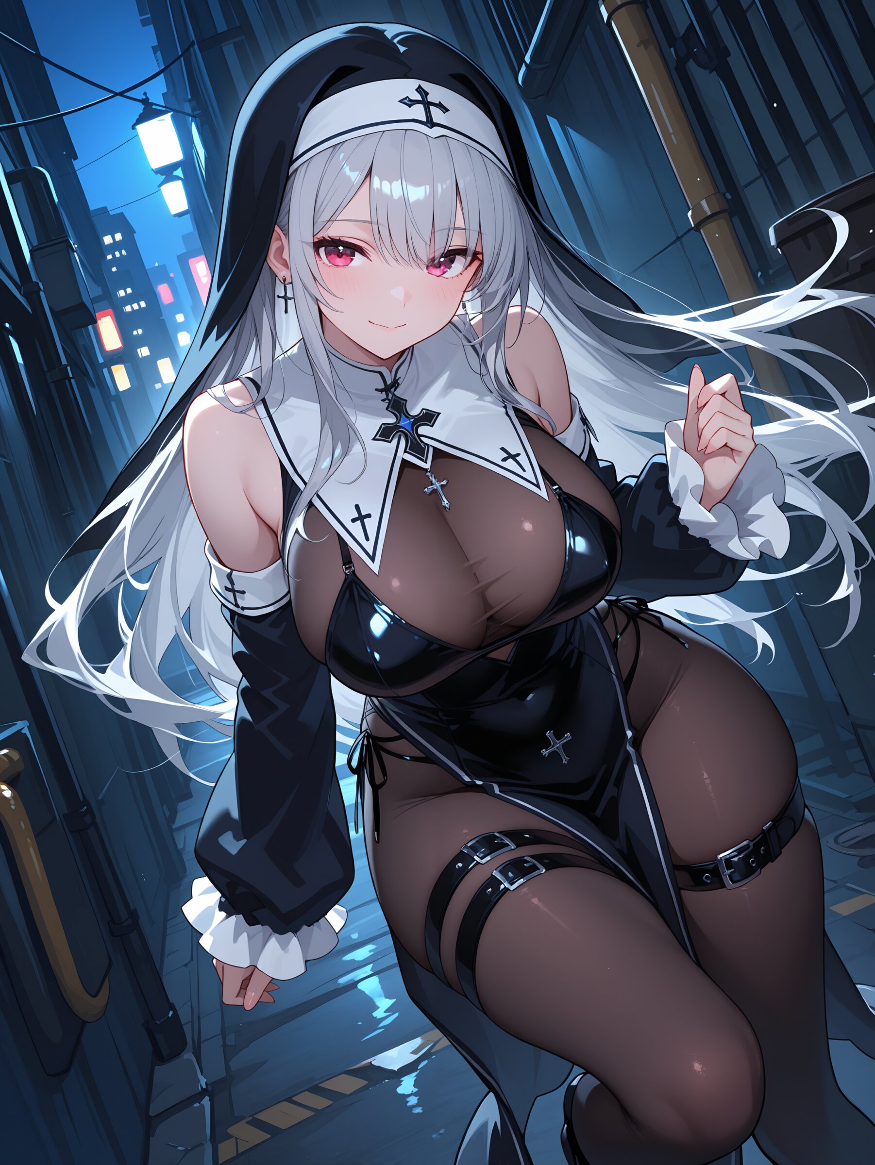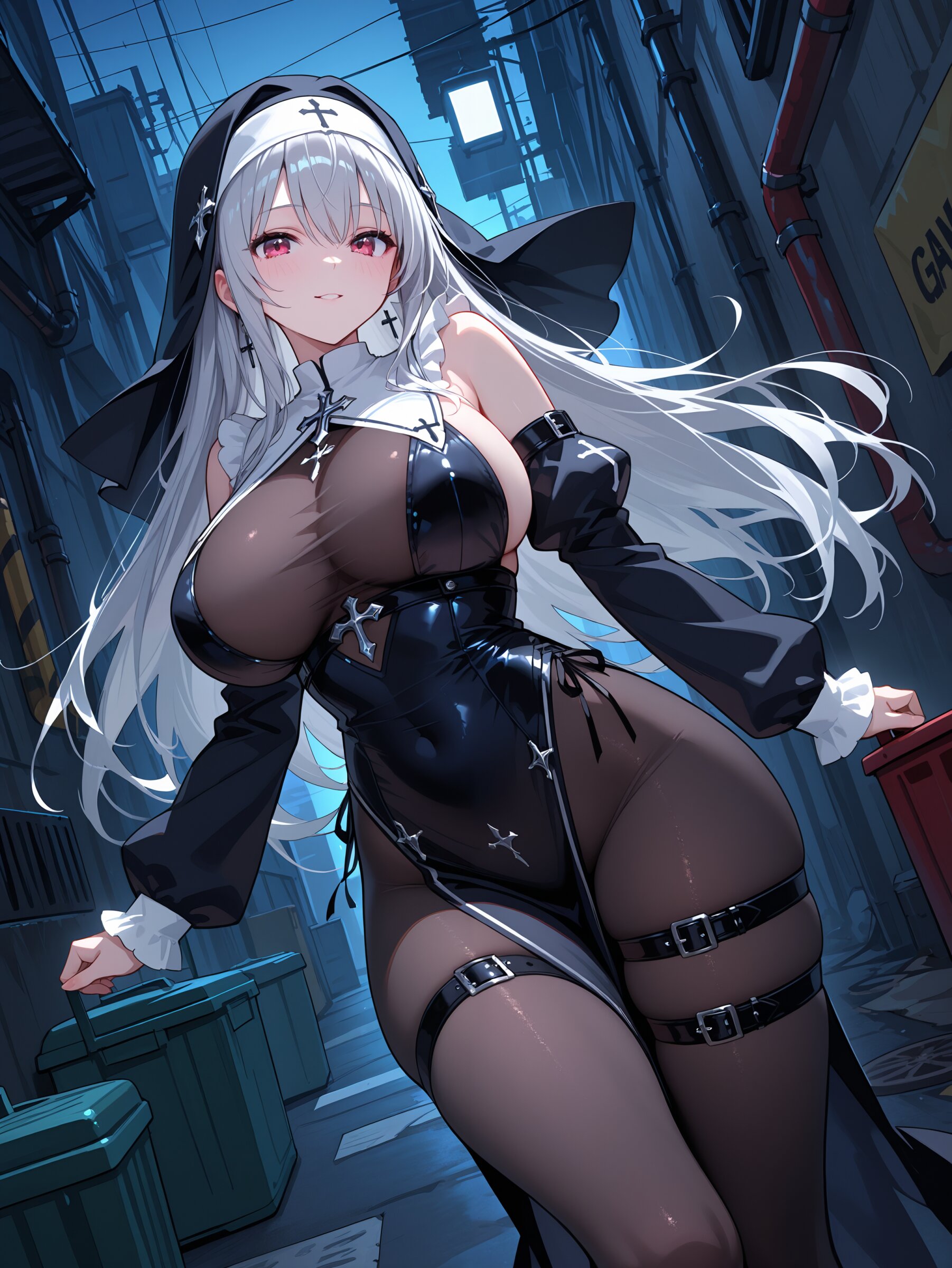 rating explicit,,silver hair, long hair, straight hair, beautiful big breasts, cool face, gothic,nun, sleeveless, detached sleeves,sleeves past wrists,pantyhose, thigh belt, garbage alley,night, dynamic angle,dynamic pose,breasts focus,,masterpiece,best quality,intricate detail,absolutely resolution,8k,newest,hand-drawn style, sketch,
