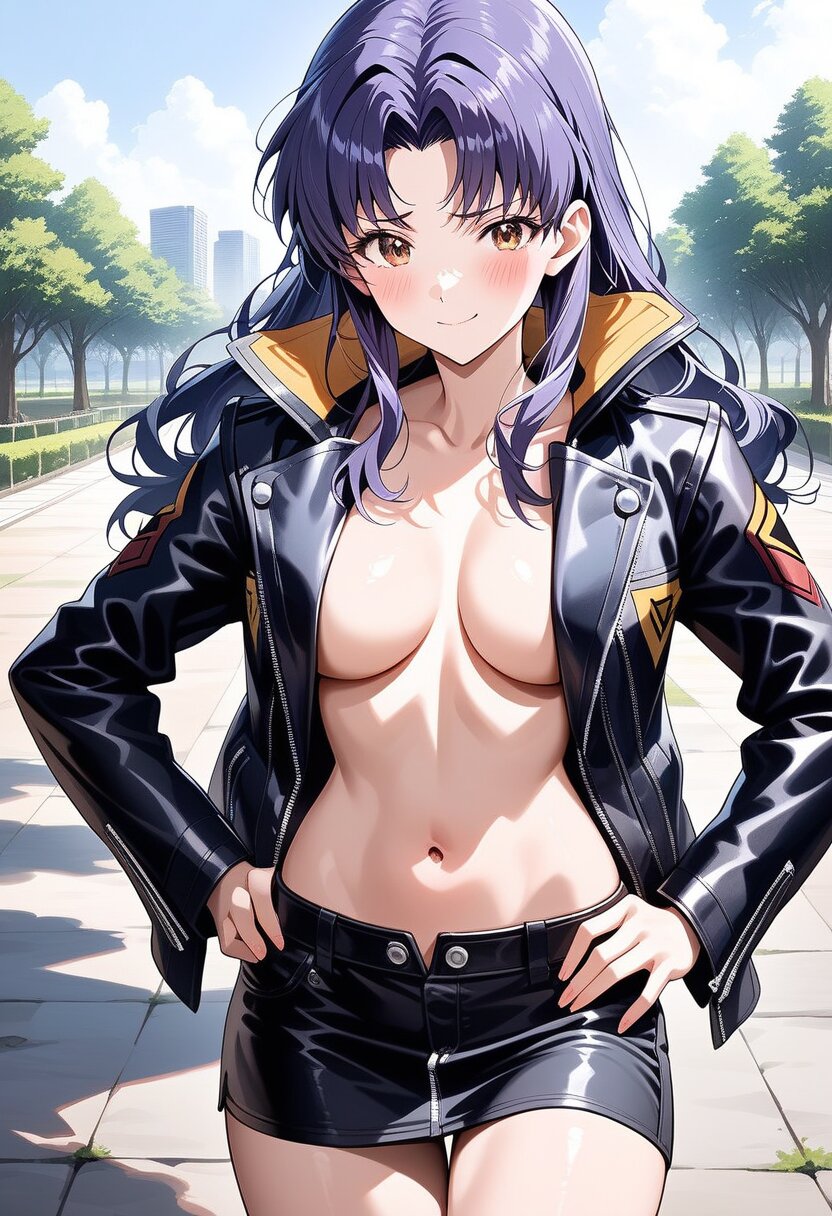 katsuragi misato, A woman, black leather jacket (fully unzipped and open at the front), nothing under the jacket (bare skin), black leather skirt, standing with hands on hips, shyly smiling (blushing), park, drawn from the knees up ※DaysAI用なので、他の生成AIで使う場合は調整が必要になると思います。