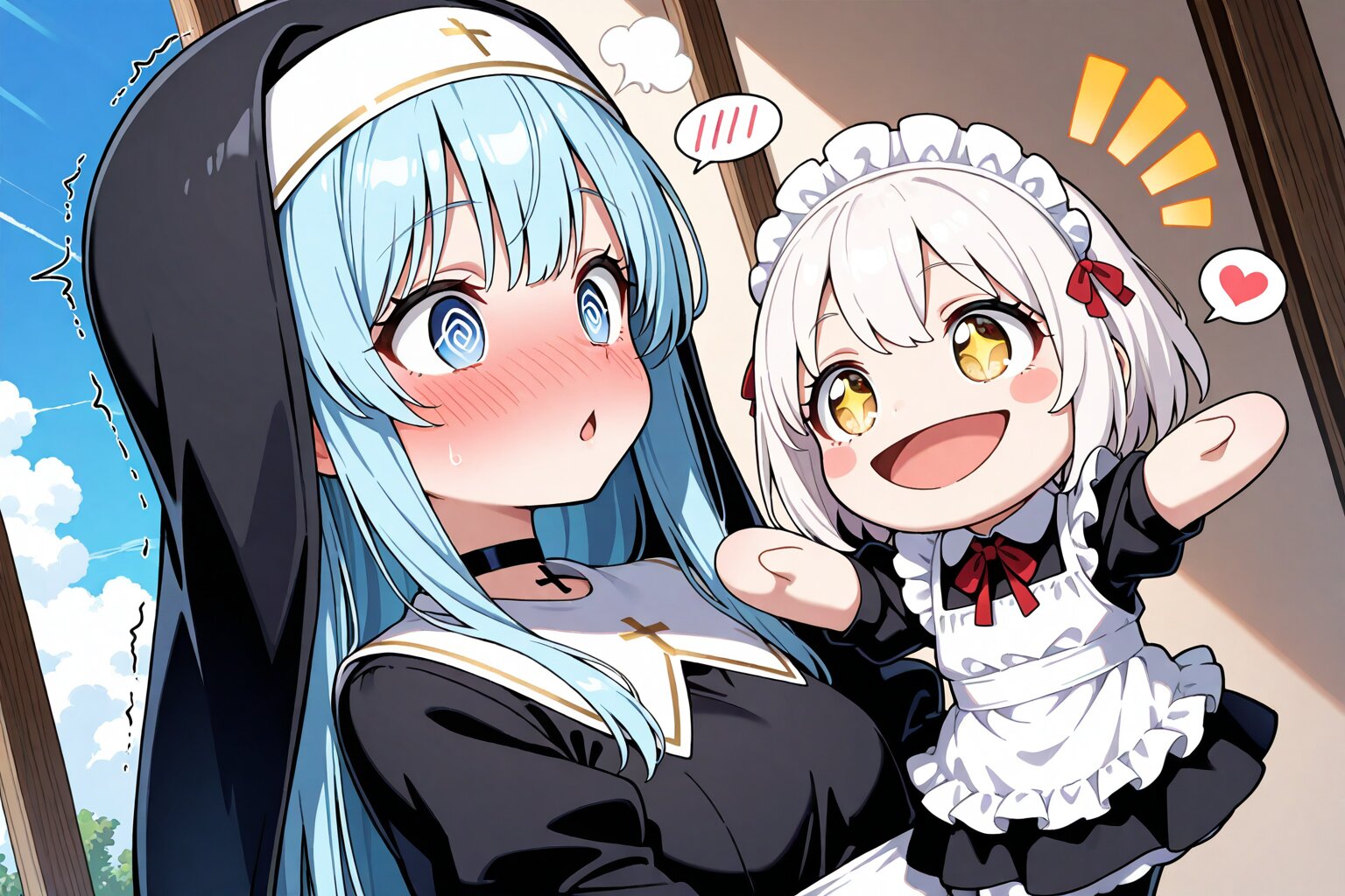 1 little girl, solo, diagonal angle, upper body, masterpiece, best quality, amazing quality, very aesthetic, sky blue hair, long hair, straight hair, blue eyes, @_@, chestnut mouth, embarrassing, confused, blush, full-face_blush, head steam, trembling, ^^^, flying sweatdrops, choker, nun outfit, hand puppet, face-to-face, spoken blush, BREAK, 1 little girl, solo, diagonal angle, upper body, masterpiece, best quality, amazing quality, very aesthetic, white hair, short hair, yellow eyes, +_+, open mouth, smile, cheerful, +++, notice lines, choker, maid outfit, hand puppet, face-to-face, spoken heart,