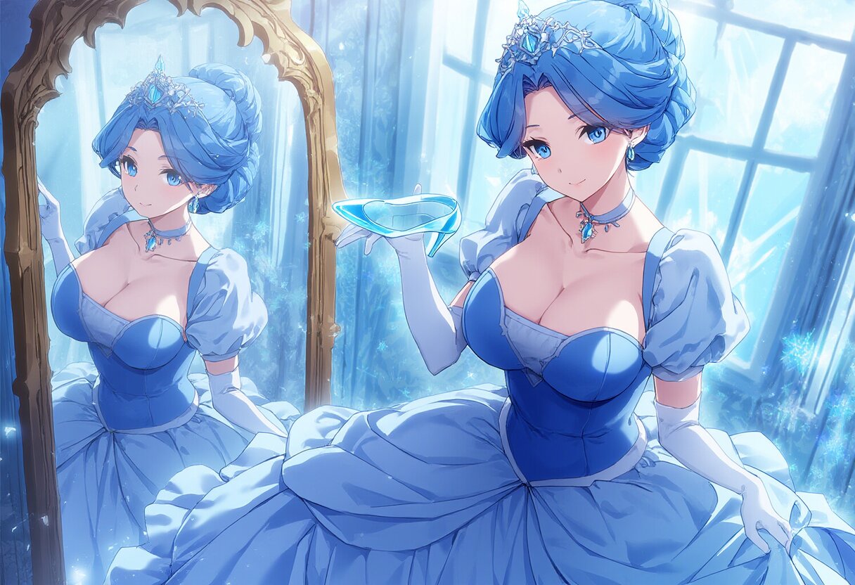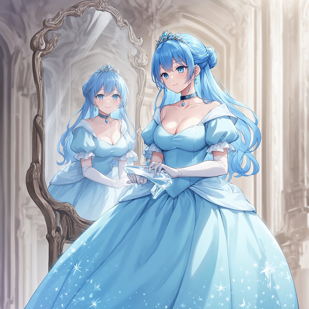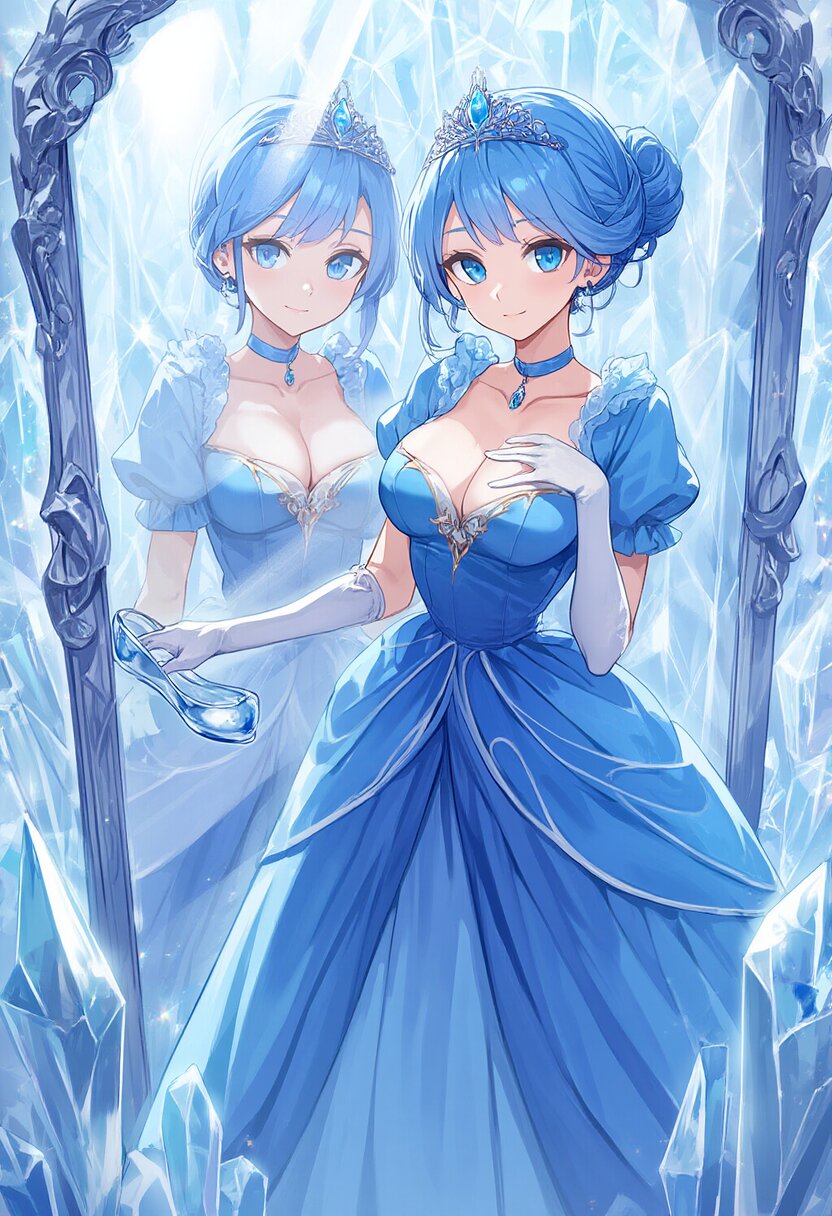 {{{highly detailed}}}, {{official style}}, {100-layer}, {{ultra-high resolution}}, {{{hi-vision anime}}}, {{intricate}}, {{cinderella (grimm), grimm's fairy tales}}, 1girl, solo, blue hair, large breasts, single hair bun, blue eyes, tiara, light smile, jewelry, collarbone, cleavage, blue gown, white elbow gloves, puffy sleeves, short sleeves, glass slipper, standing, cowboy shot, {{{{{{stand mirror, mirror}}}}}}, glass world, glass room, crystal world, crystal room, {{glass, crystal}}, {{{masterpiece}}}, {{{best quality}}}, {{{very aesthetic}}}, {{{ultra-detailed}}}, {illustration}, {{{extremely detailed}}}, {{{an extremely delicate and beautiful}}}