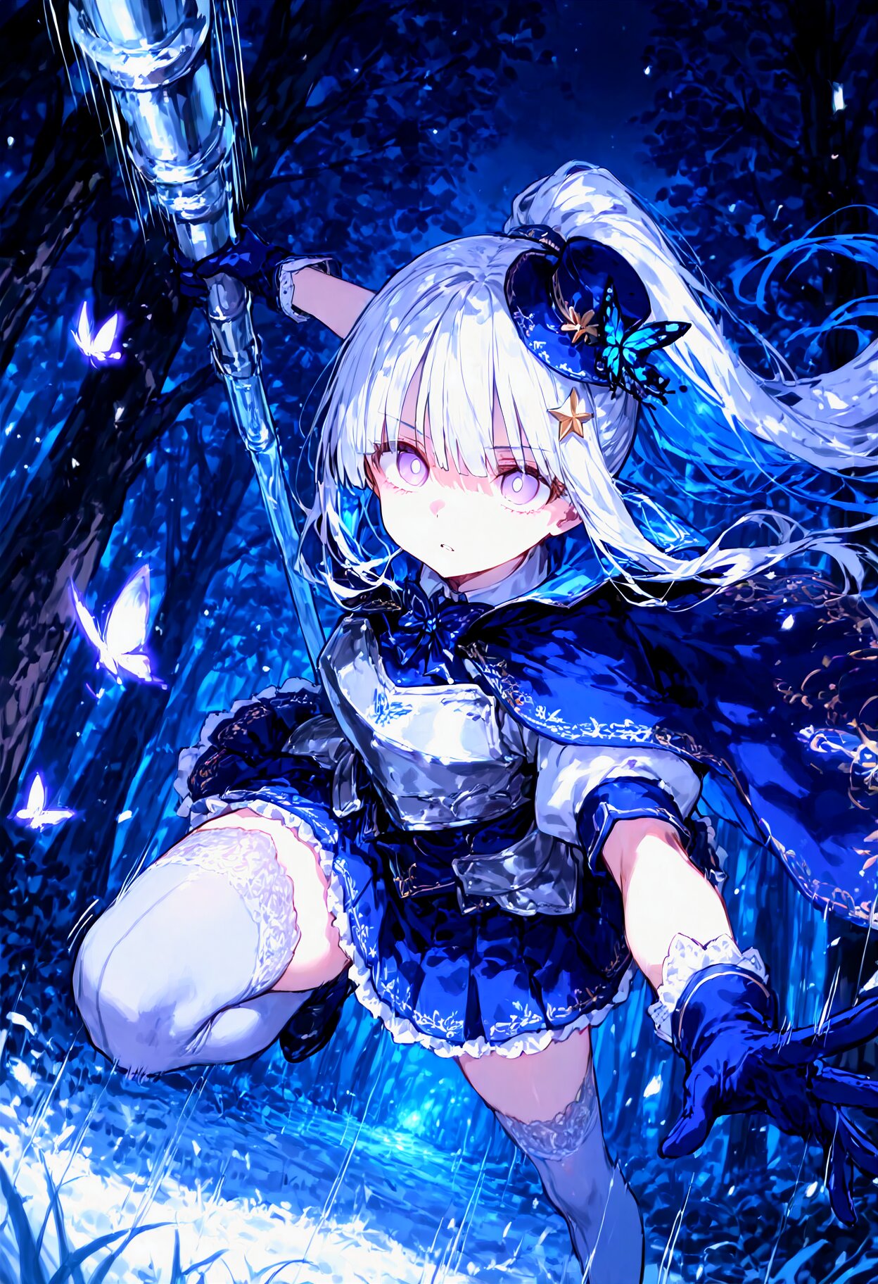 amazing quality,best quality,ultra-detailed,ultra-detailed-eyes, beautiful detailed background, (pale color:0.8), purple theme,,blue theme, night sky, solo,1girl, cinematic light,, parted lips,Expressionless, (big eyes:1.1),half-closed eyes, tareme, (glowing eyes:0.8), pale purple eyes,purple eyes, (silver hair:1.1), (dark blue hair colored inner hair:0.8), long hair,very long hair, ponytail, eyebrows visible through hair, mini hat, (star hair ornament,:0.7), darkblue accent cape,darkblue skirt, embroidery silver breastplate, thighhighs, ,outdoors,wilderness forest, butterfly, perspective,(jumping:0.7), one leg up, (pole weapon:1.1),holding weapon,motion lines, fighting stance, gloves,, (looking at viewer,:0.8) , <lora:noline-16oa:-1.2> <lora:sdxl2-flat2-512b:0.5>