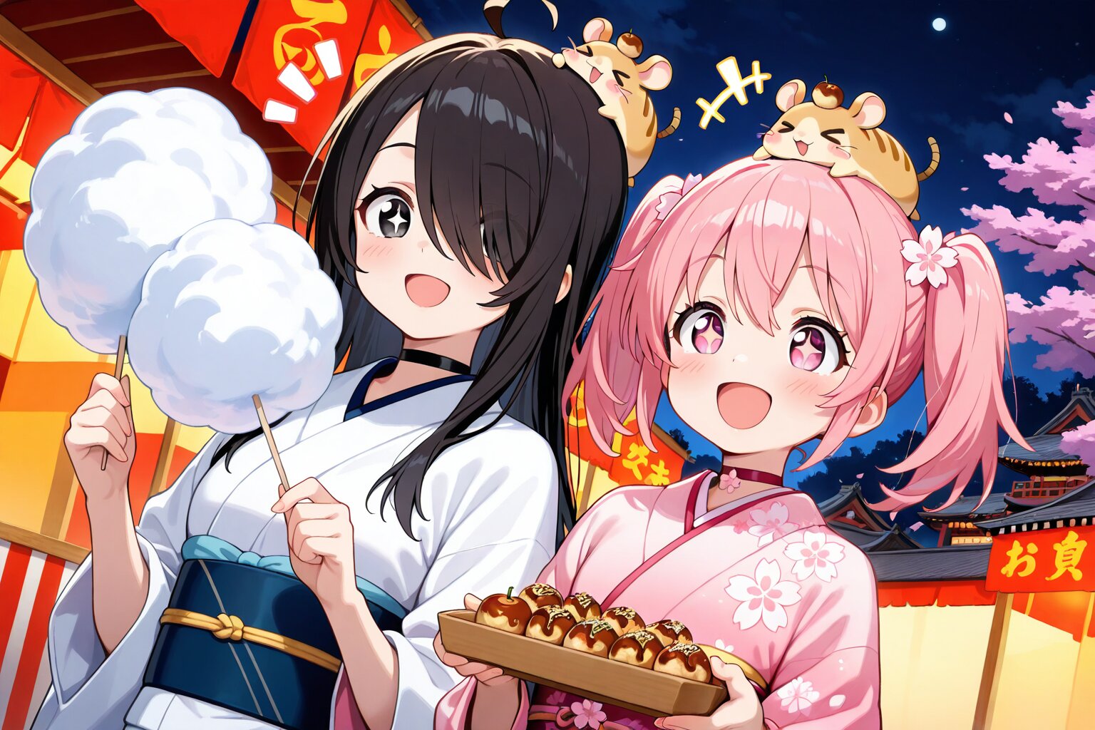 2 little girls, diagonal angle, upper body, masterpiece, best quality, amazing quality, very aesthetic, black hair, long hair, ahoge, (hair over one eye:1.2), black eyes, +_+, open mouth, smile, cheerful, +++, notice lines, choker, white kimono, ghost, > <, holding cotton candy, night, cherry blossom, japanese festival, japanese festival, BREAK, 2 little girls, diagonal angle, masterpiece, best quality, amazing quality, very aesthetic, pink hair, twintails, pink eyes, +_+, open mouth, smile, cheerful, +++, notice lines, choker, sakura kimono, holding takoyaki, hamsters on her head, > <, night, cherry blossom, japanese old castle,japanese festival,