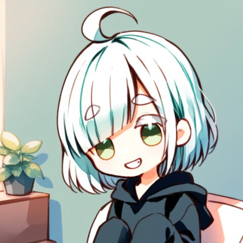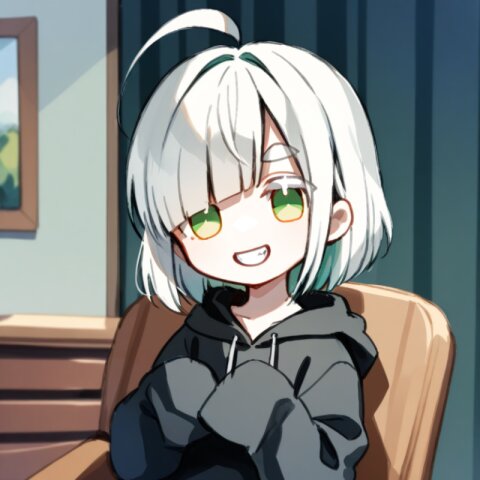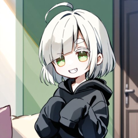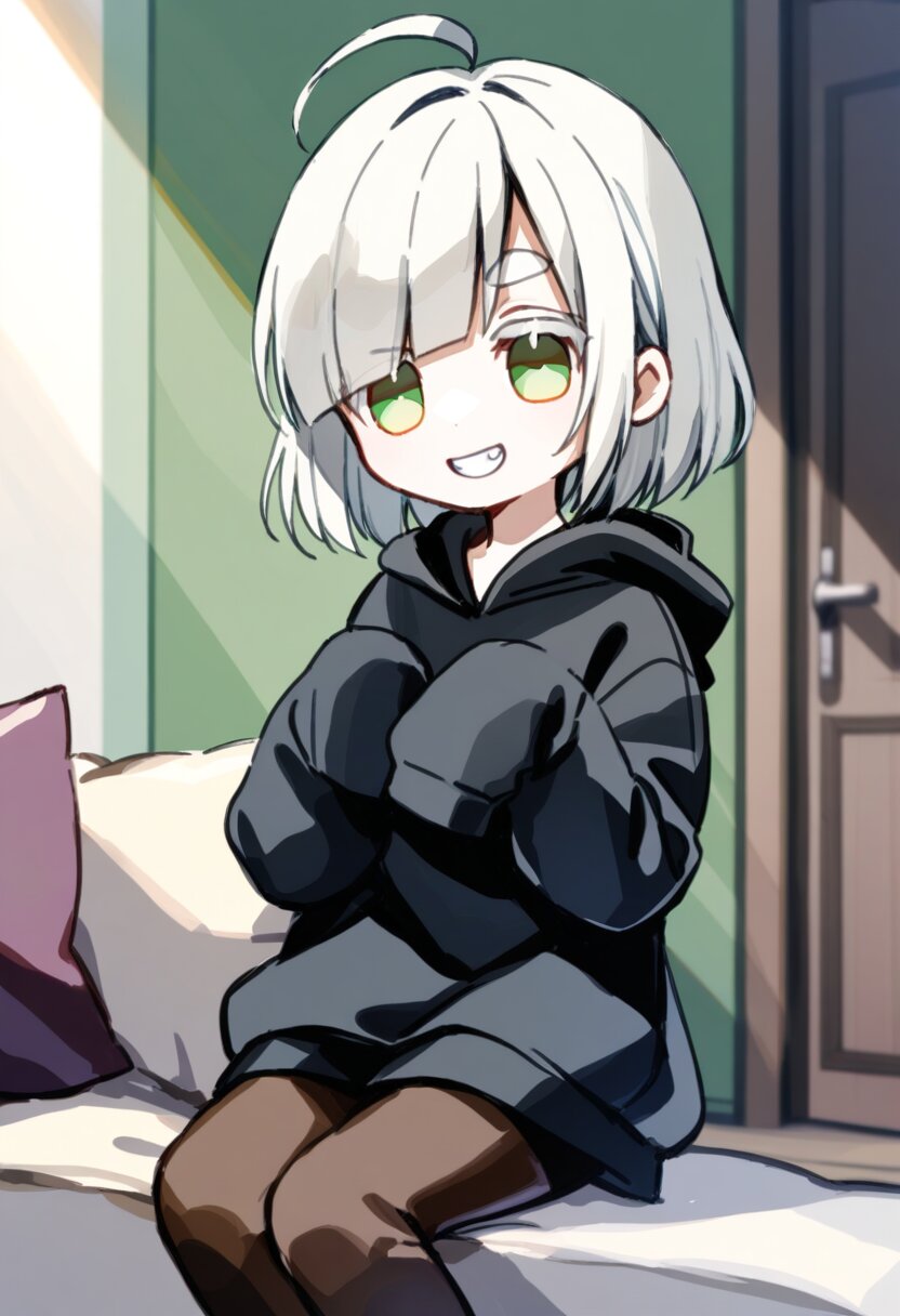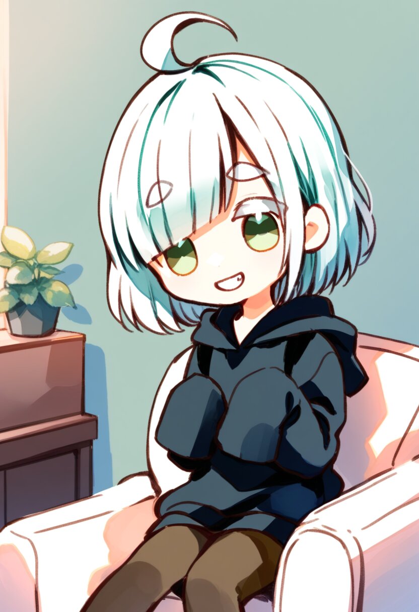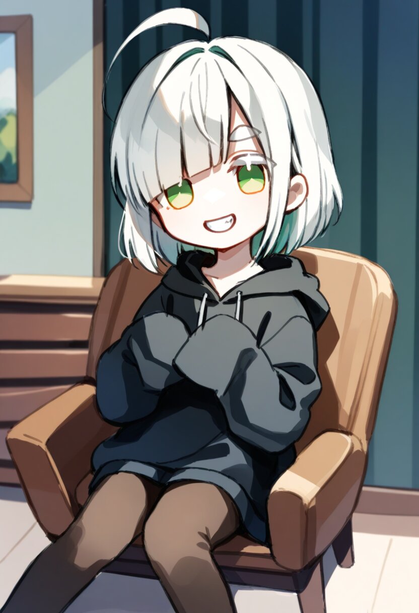 <lora:inmnstylexl:1>, best quality, masterpiece, very aesthetic, watercolor painting, general, chibi, 1girl, 10 years old, (bright white hair), short hair, blunt bangs, white thick eyebrow, white colored eyelashes, (hair over one eye), ahoge, oversize black hoodie, sleeves past wrists, brown tights, smile, white teeth, point at own teeth, living room, mint green eyes