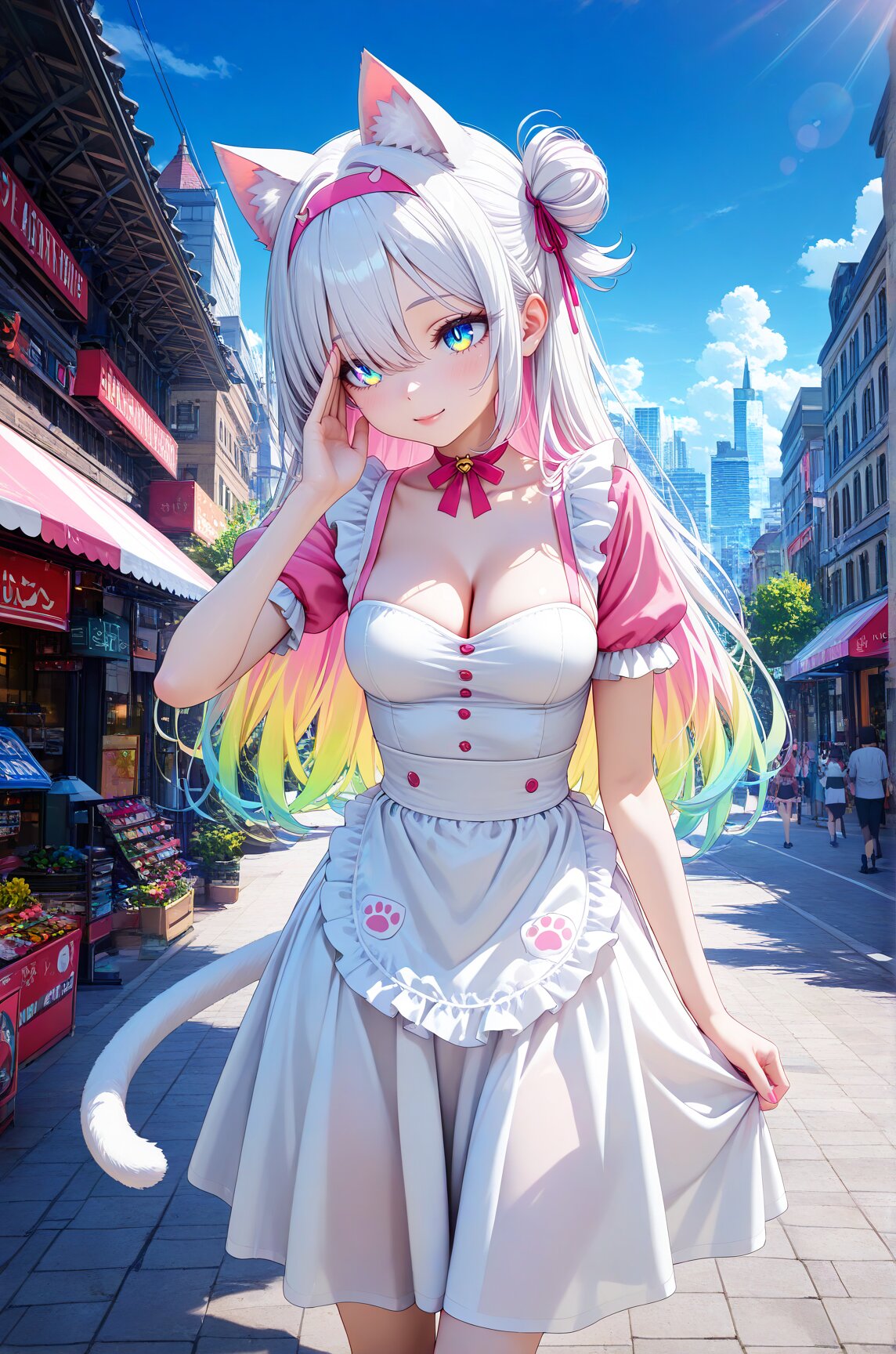 Anime illustration, CG art, 3D model, 3D rendering, 3D skin texture, high detail, depth of field, 1 person, cat ears, cat tail, hime cut, side ponytail, slanted eyes, sky blue eyes, white skin, gothic lolita, 8K, masterpiece, best quality, amazing quality, very aesthetic, (volumetric lighting), overexposed,