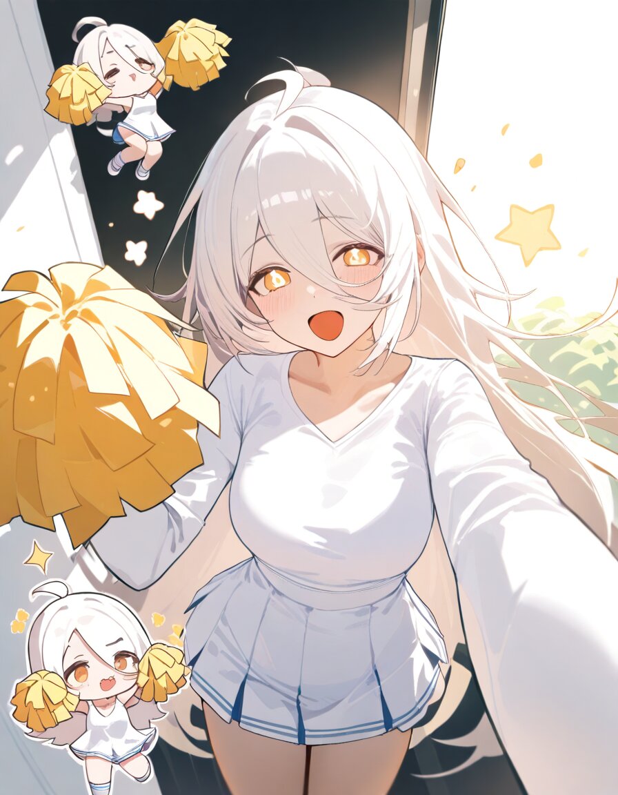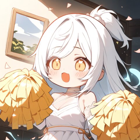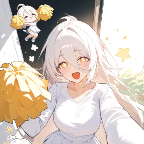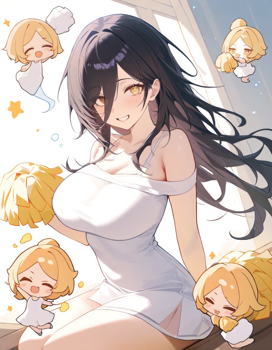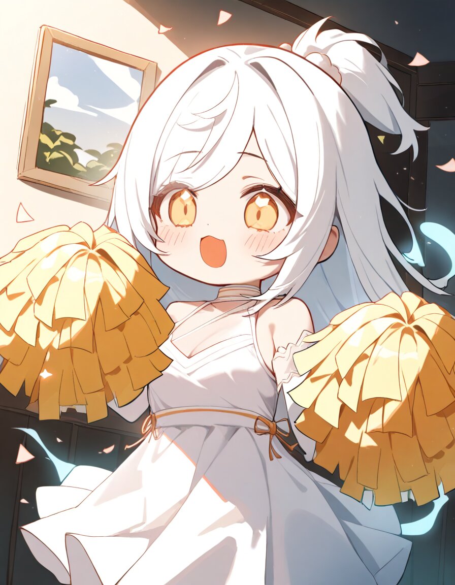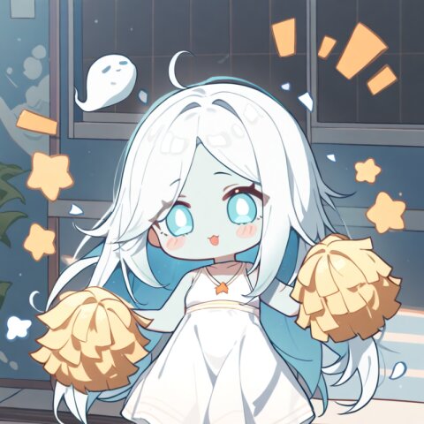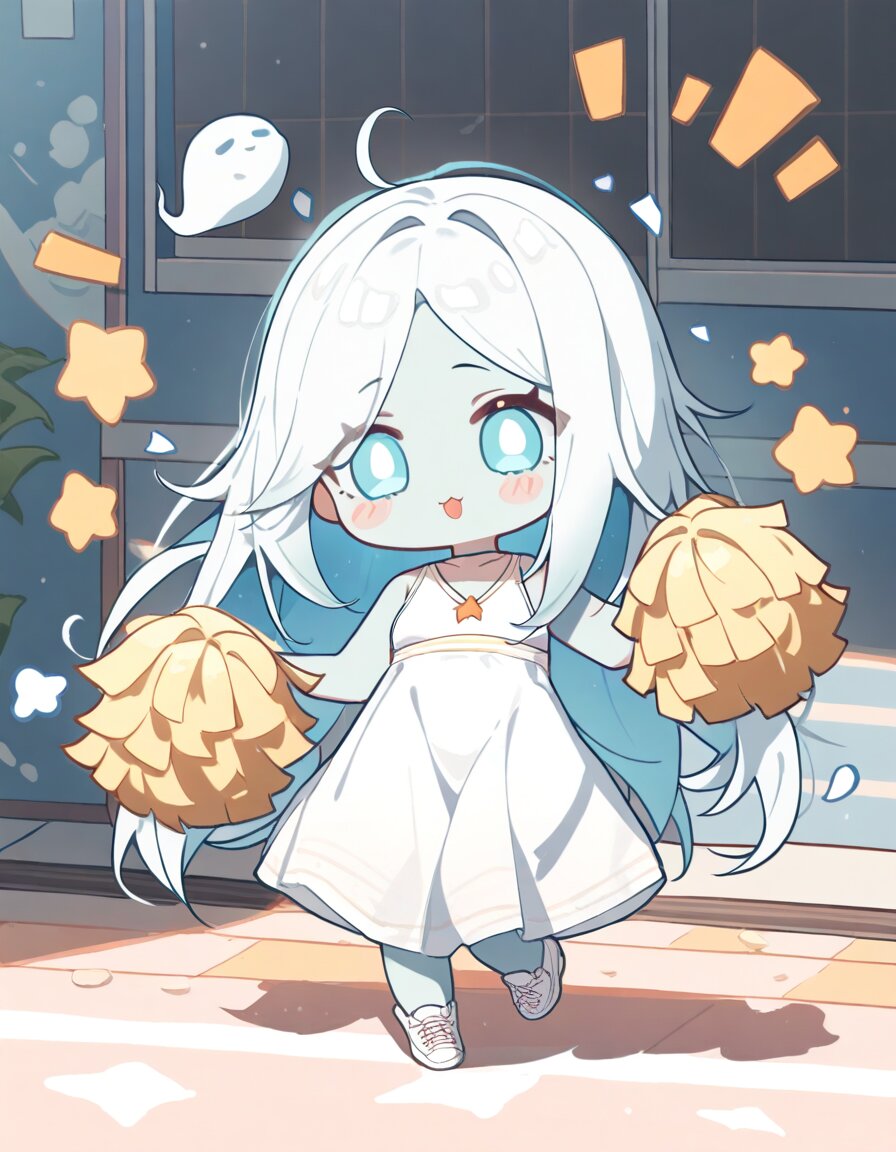 1girl, solo, morning, ghost girl, dress, white dress, pom pom \(cheerleading\), cheering, (chibi:1.2), masterpiece, great score, high score, absurdres, <lora:add-detail-xl:1>