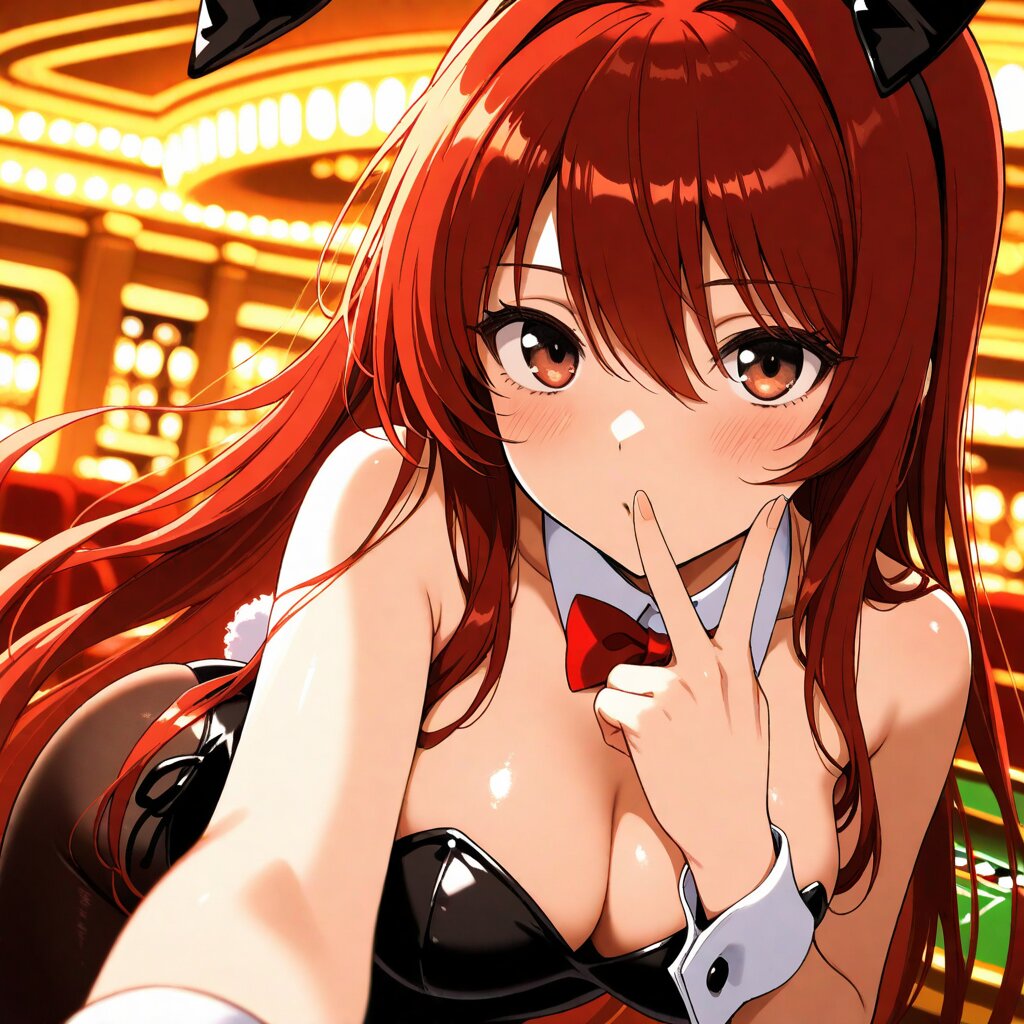masterpiece,best quality,amazing quality,very aesthetic,absurdres,newest,okashirastyle,highres, 1girl,long_hair,brown_hair,red_eyes,hair_between_eyes,very_long_hair,brown_eyes,red_hair,floating_hair,hair_intakes,straight_hair,shiny_skin, bunny_girl, selfie, v-sign, peace sign, casino, dealer