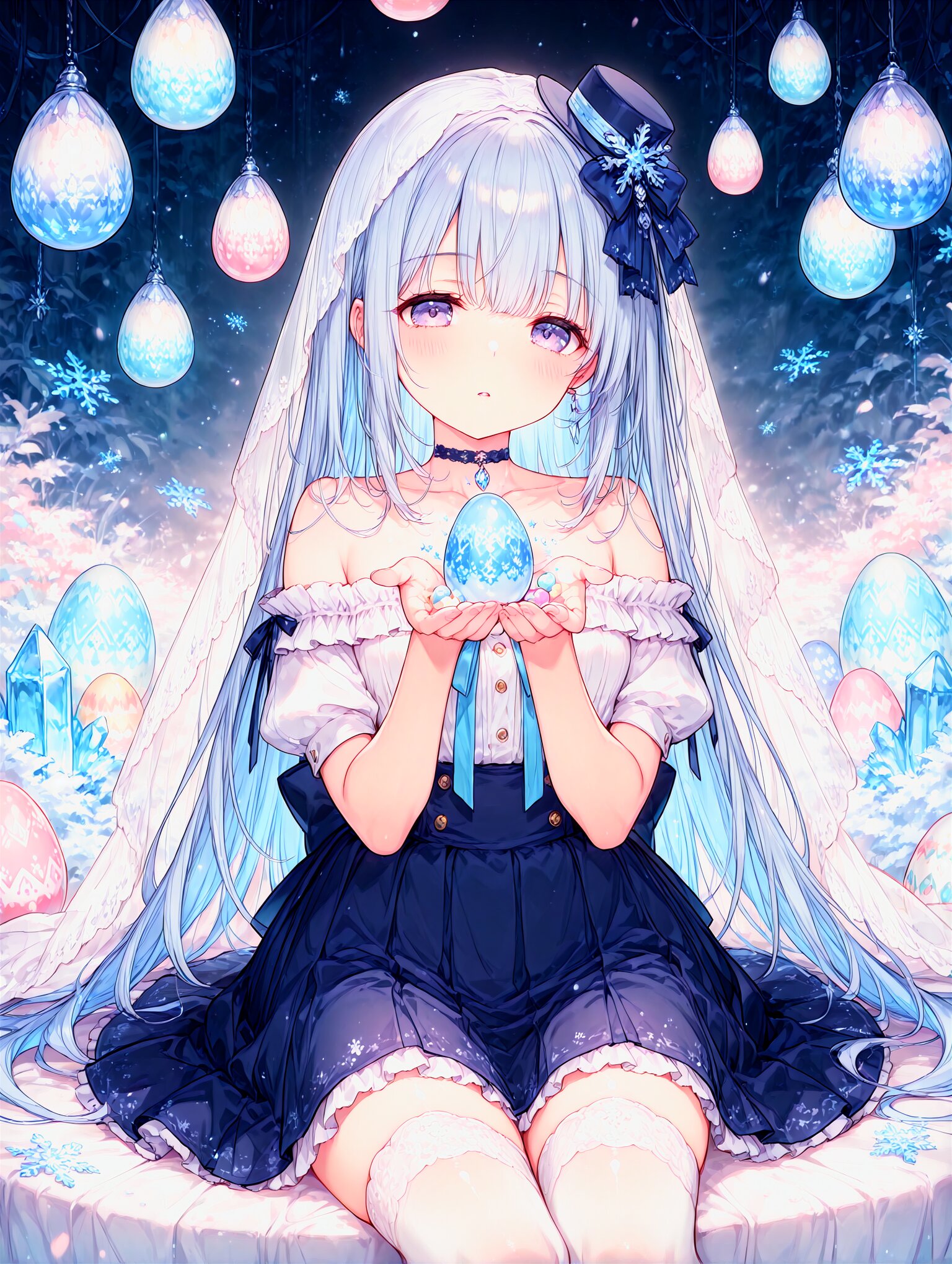 beautiful detailed background, best quality, (pale color,:1.2) pastel colors, solo, collarbone, parted lips,(Expressionless:0.8), big eyes,(half-closed eyes:0.8), tareme, pale purple eyes, thighhighs, (silver hair:1.2), (dark blue hair colored inner hair:0.8), long hair,very long hair eyebrows visible through hair, white off-shoulder and dark blue skirt, see-through veil, mini hat, blue strapping ribbon and bow, frills, strapping ribbon, choker, round lighting, temptation, crystal, many ice block, snowflakes, egg shaped lighting, easter egg,egg, egg on the palm,present, sitting , light shafts, looking at viewer, <lora:sdxl-shadow_01:-1.2> <lora:noline-16oa:0.9> <lora:sdxl2-flat2-512b:-0.8>