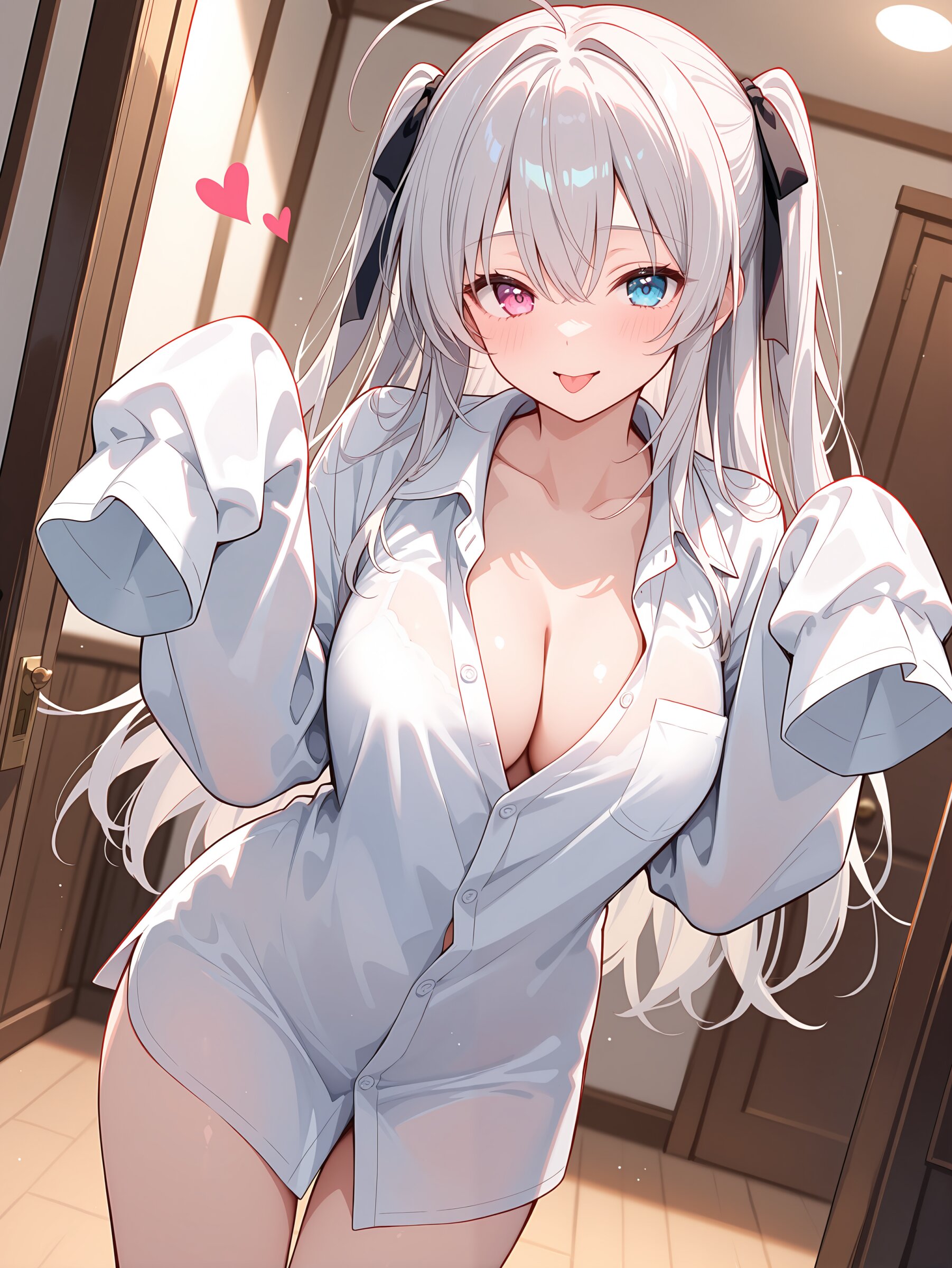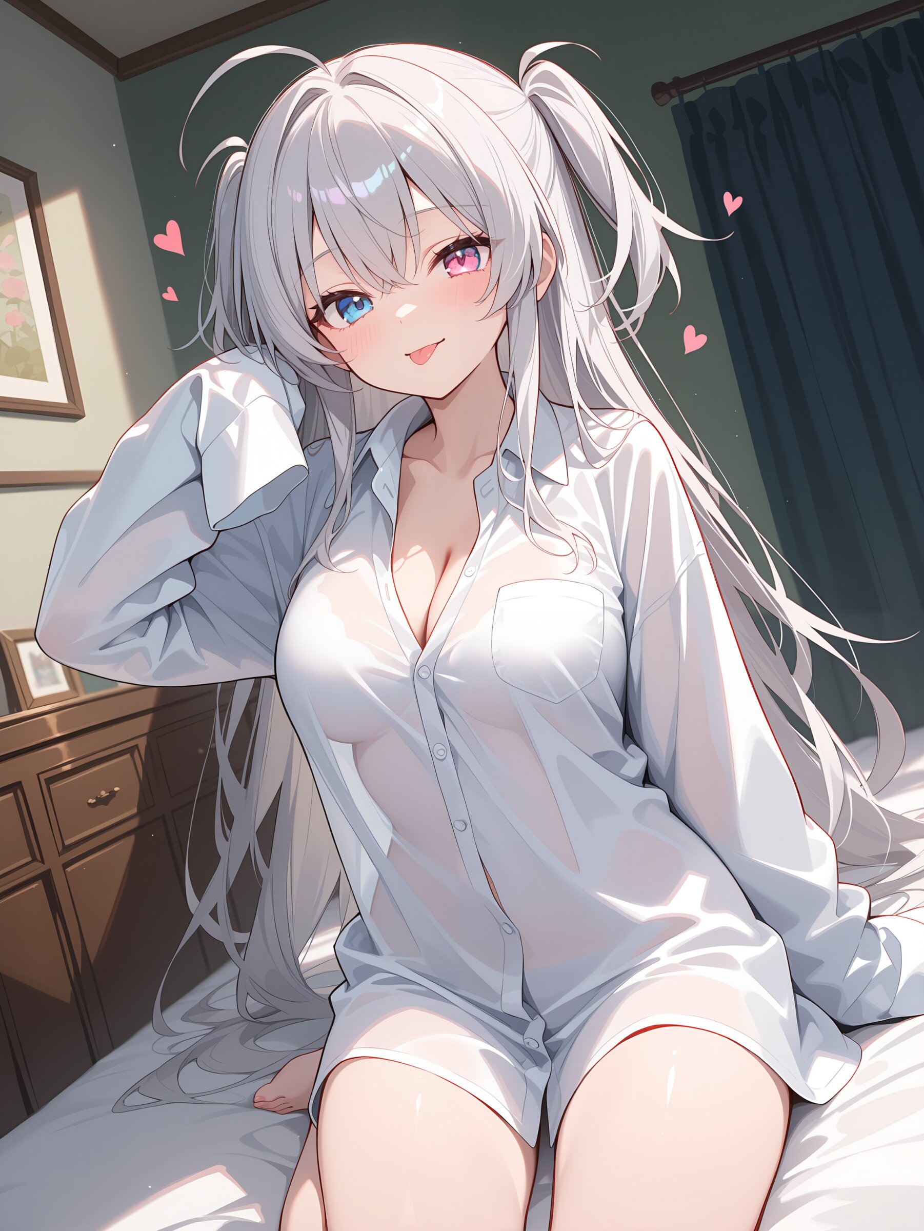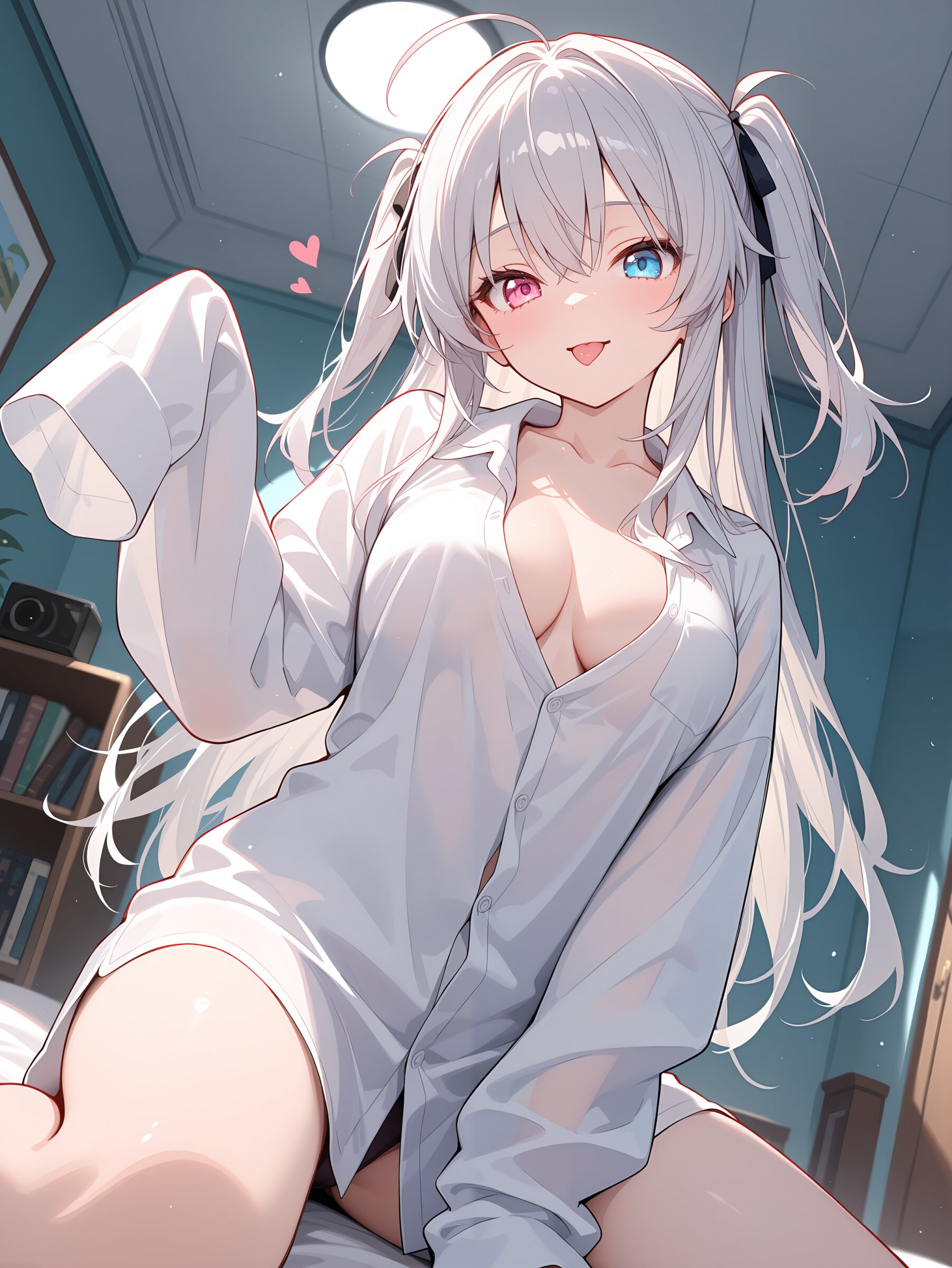rating safe, medium large breasts,silver hair,long hair,two side up,ahoge,pink eyes,blue eyes,heterochromia,, collared shirt, oversized shirt, sleeves past fingers, long sleeves, in room,cinematic angle, little tongue, heart racing, ,masterpiece,best quality,intricate detail,absolutely resolution,8k,newest,hand-drawn style, sketch,