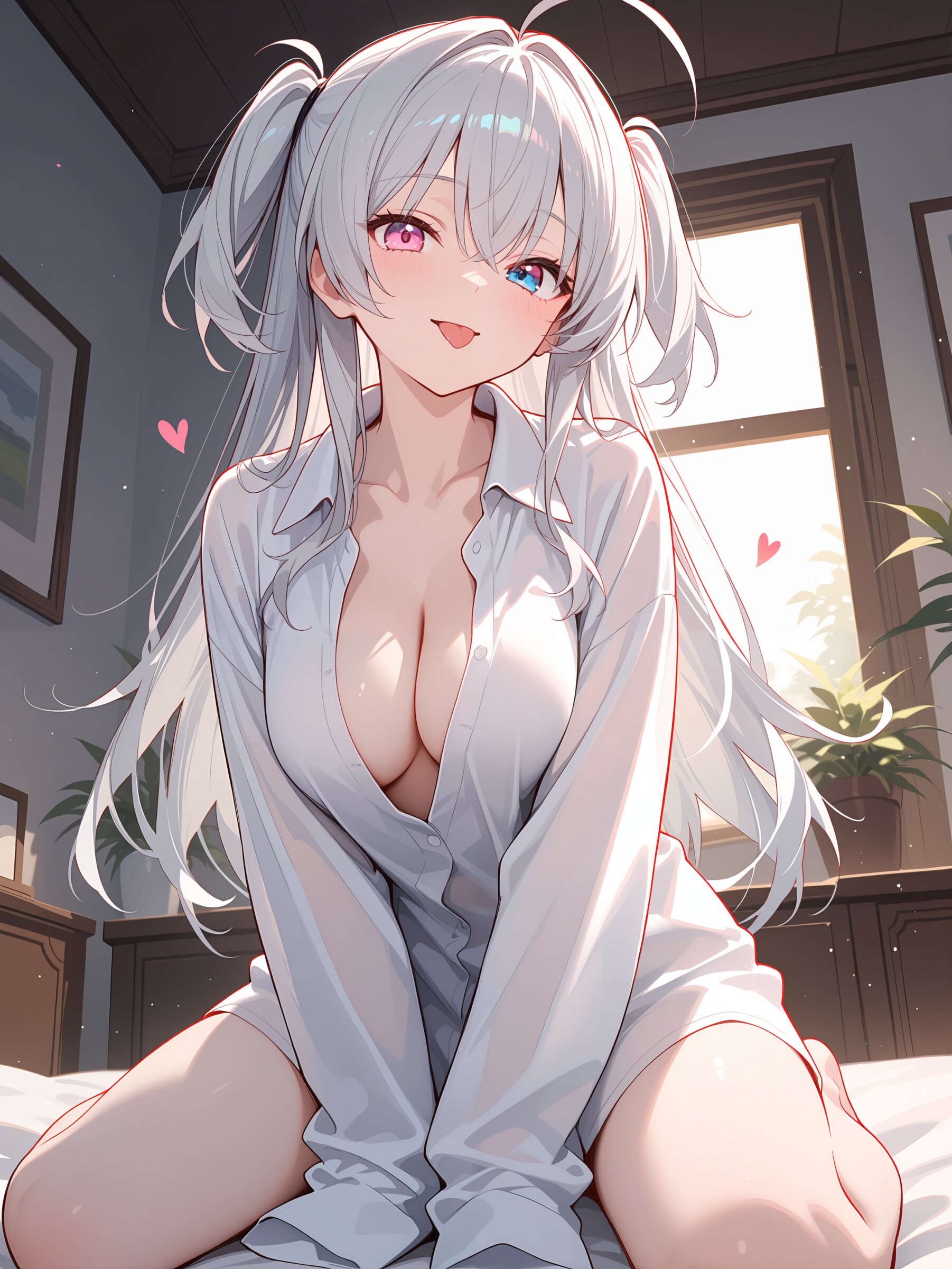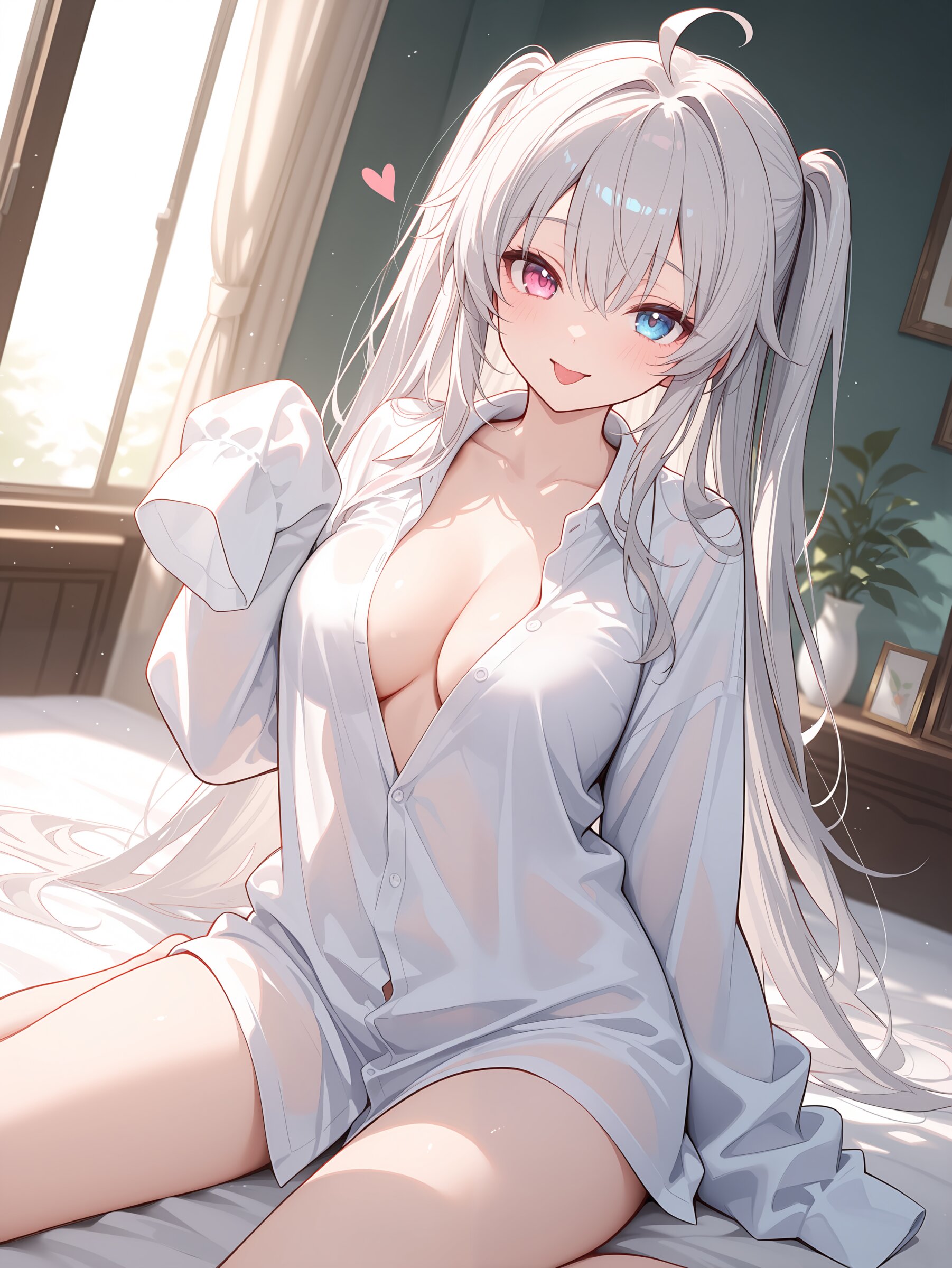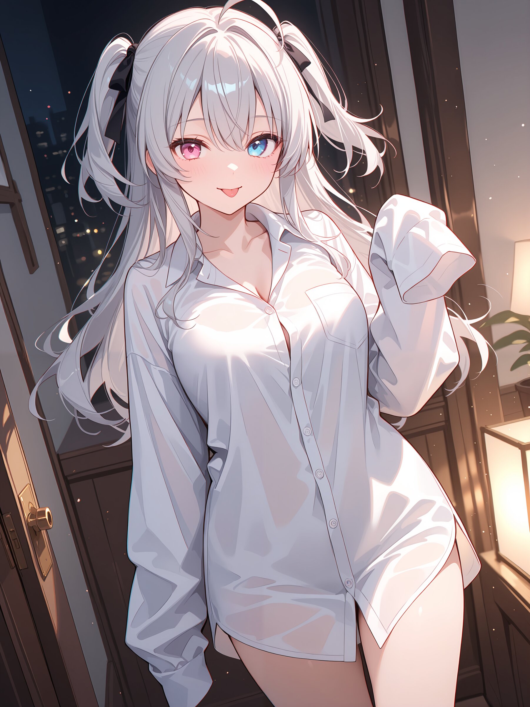 rating safe, medium large breasts,silver hair,long hair,two side up,ahoge,pink eyes,blue eyes,heterochromia,, collared shirt, oversized shirt, sleeves past fingers, long sleeves, in room,cinematic angle, little tongue, heart racing, ,masterpiece,best quality,intricate detail,absolutely resolution,8k,newest,hand-drawn style, sketch,