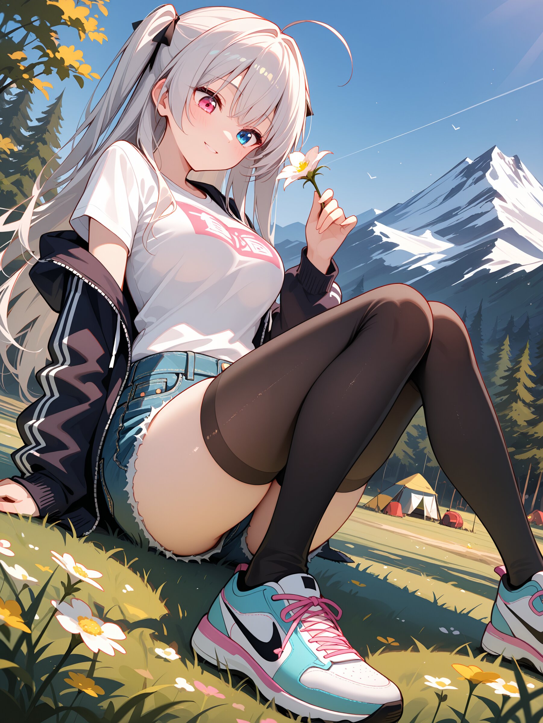 rating explicit, medium large breasts,silver hair,long hair,two side up,ahoge,pink eyes,blue eyes,heterochromia,, hoodie jacket,,plainwhite shirt, T-shirt,short denim pants,thighhighs, sneakers, mountain,(camp:1.2),spring,from side,leg focus,smile, sitting on ground,knees together feet apart, flower,looking flower,looking down,holding flower, dynamic angle,,masterpiece,best quality,intricate detail,absolutely resolution,8k,newest,hand-drawn style, sketch,