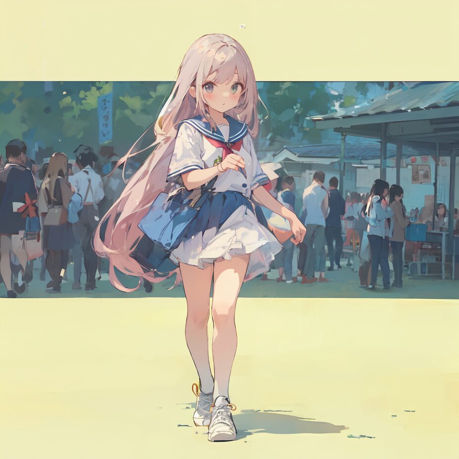 masterpiece, best quality, 1girl, Cute girl, black hair, sailor uniform, white sneakers, visiting high school festival, crowded with stalls