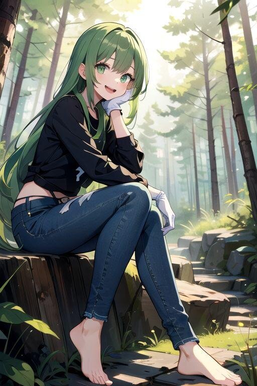 green hair, very long hair, green eyes, gloves, barefoot, (long toes:1.4), (long jeans:1.4),smile,open mouth, forest