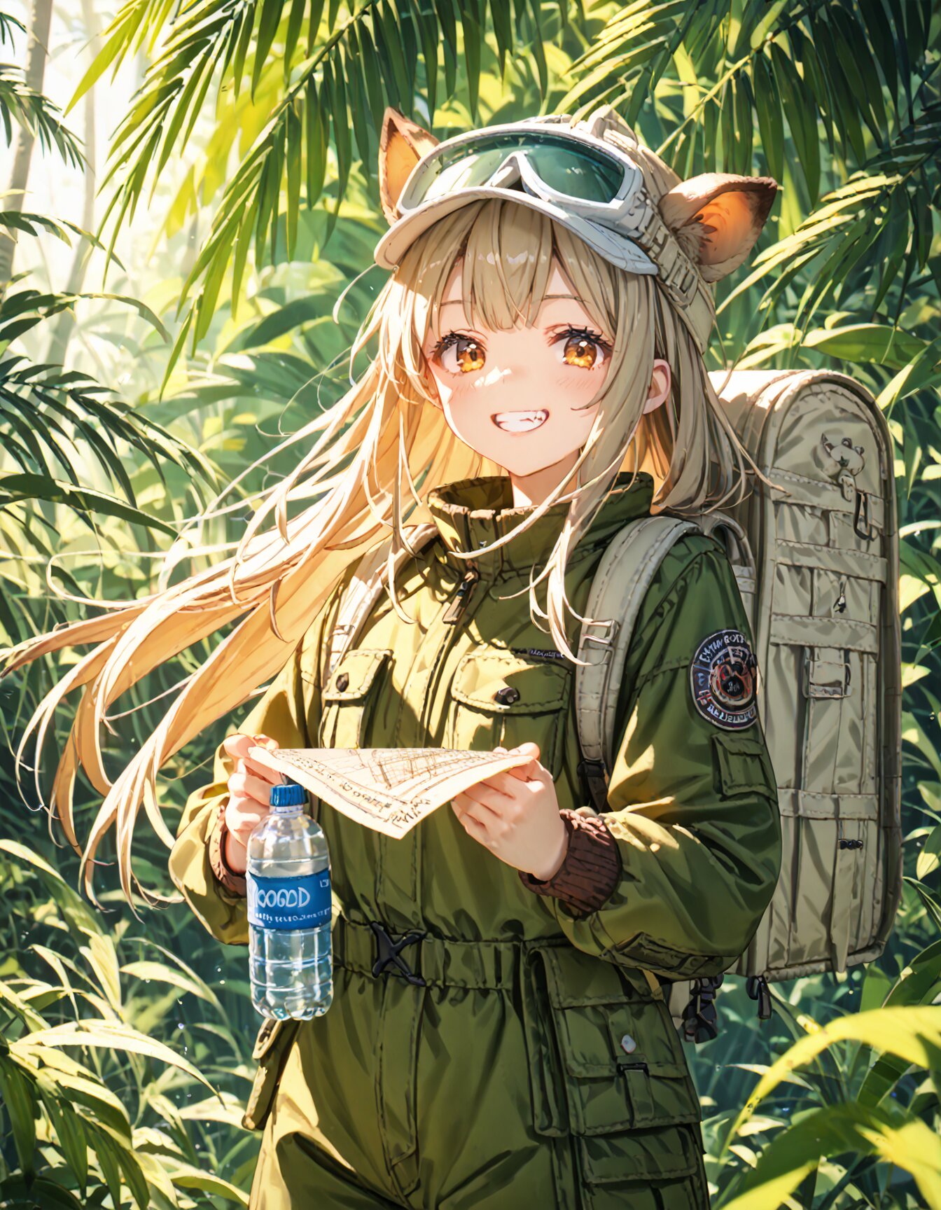 score_9, score_8_up, score_7_up, score_6_up, rating_safe, masterpiece, best quality, cowboy shot, light brown hair, long hair, amber eyes, wild boar's ears, Explorer Outfit, green Helmet, white large backpack, water bottle, (Adventure Theme), (grin showing fang), Hold the map open, Deep in the Amazon, Dense Jungle,