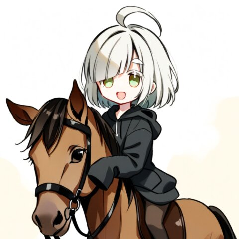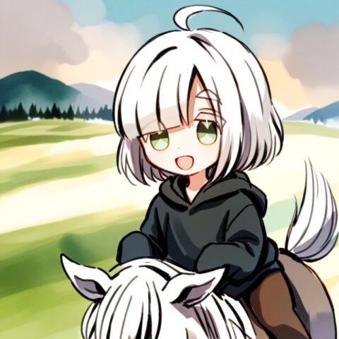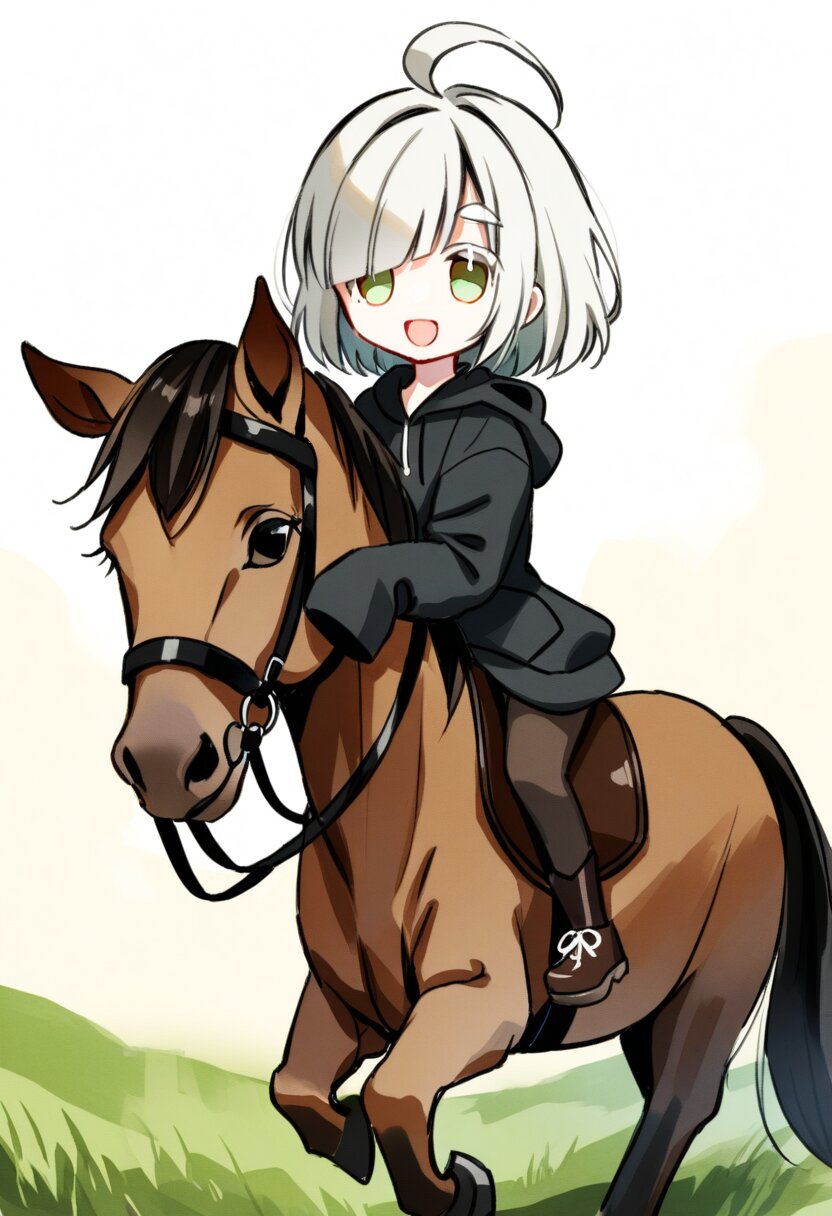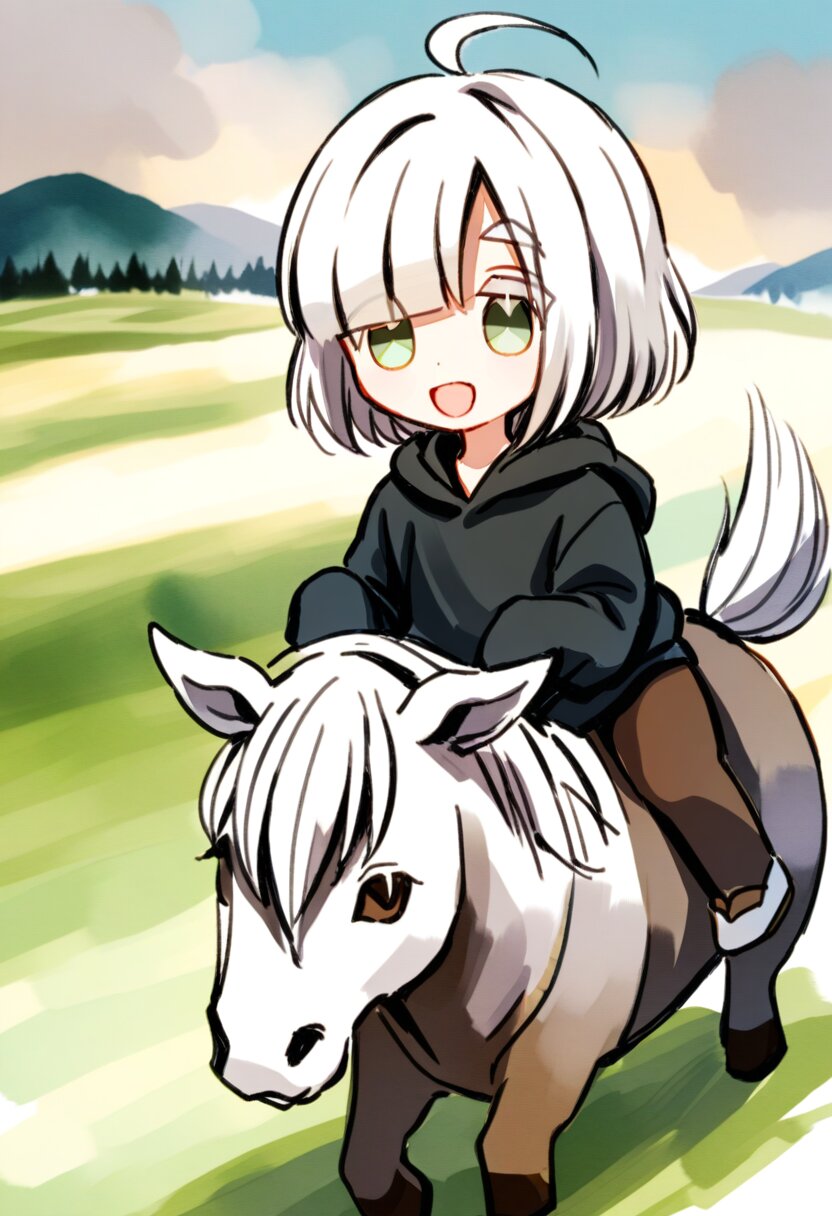 <lora:inmnstylexl:1>, best quality, masterpiece, very aesthetic, watercolor painting, general, chibi, 1girl, 10 years old, (bright white hair), short hair, blunt bangs, white thick eyebrow, white colored eyelashes, (hair over one eye), ahoge, oversize black hoodie, sleeves past wrists, brown tights, smile, open mouth, horse riding, field, mint green eyes