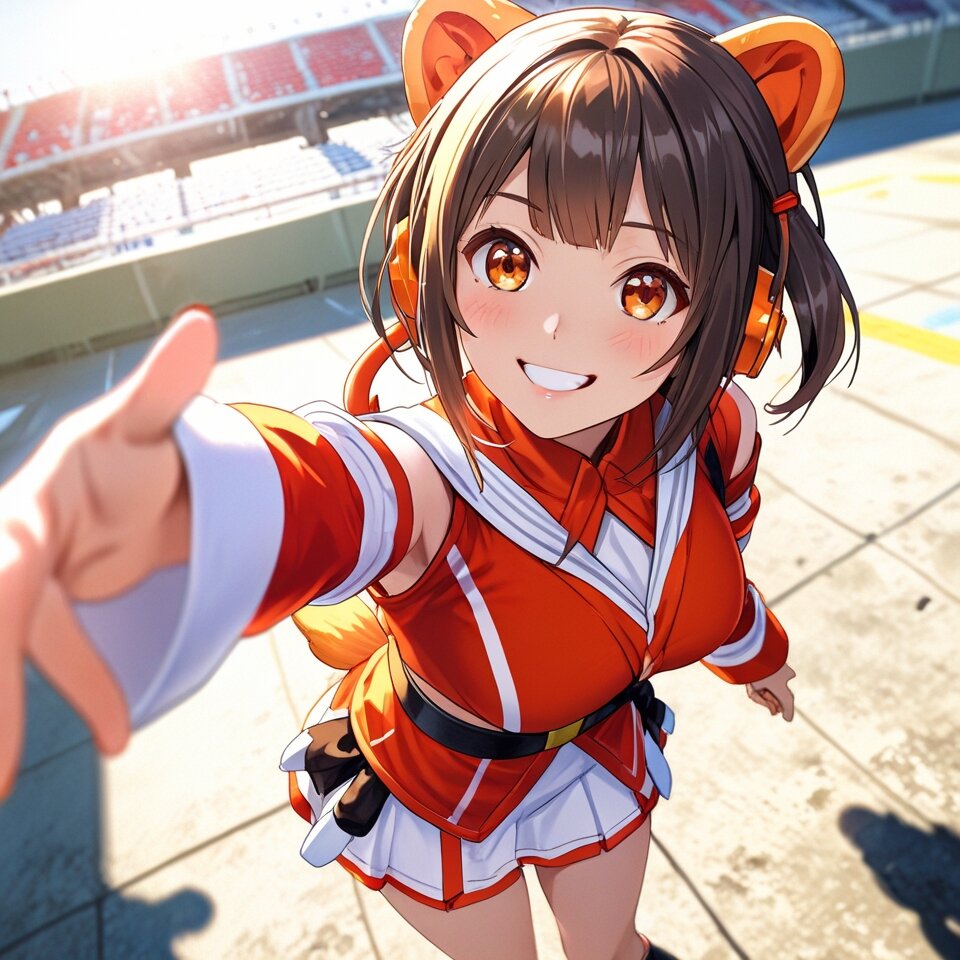 Fisheye lens. Full body. She will perform on the stadium stage in a Japanese idol uniform. She is a kawaii top idol. Big smile. headphones, Monkey kemomimis. Orange bob haircut. Japanese idol costume in the style of a Shrine maiden costume-style, open shoulder. The background is plain white. High quality, 8K Ultra HD, high detail, masterpiece, anime style digital full body portrait, soft anime tone, colorful colors, colorful woman, Luminism, 3D Effect, Enhanced Beauty,