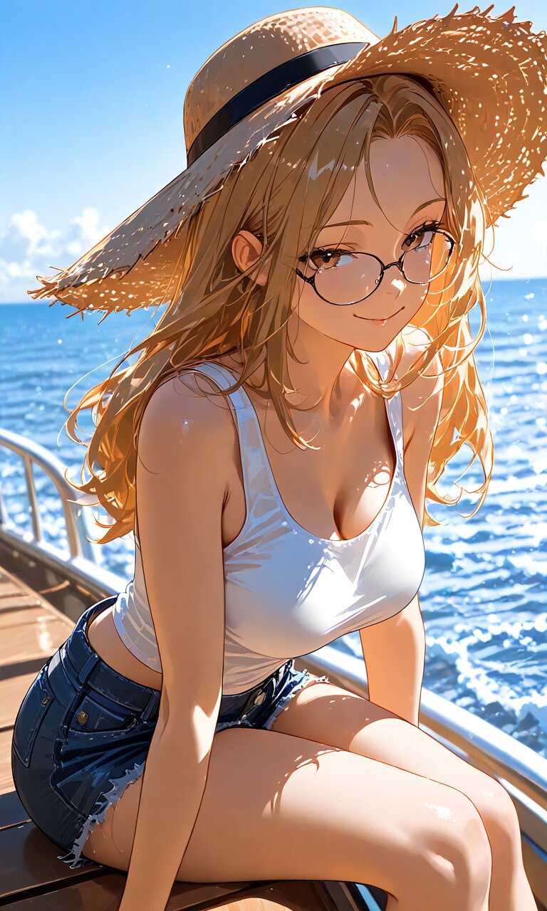 1 lady, long hair, blonde hair, glasses, white tank top, short jeans, straw hat, smile, breasts, smile, on yacht,ocean, seductive smile,