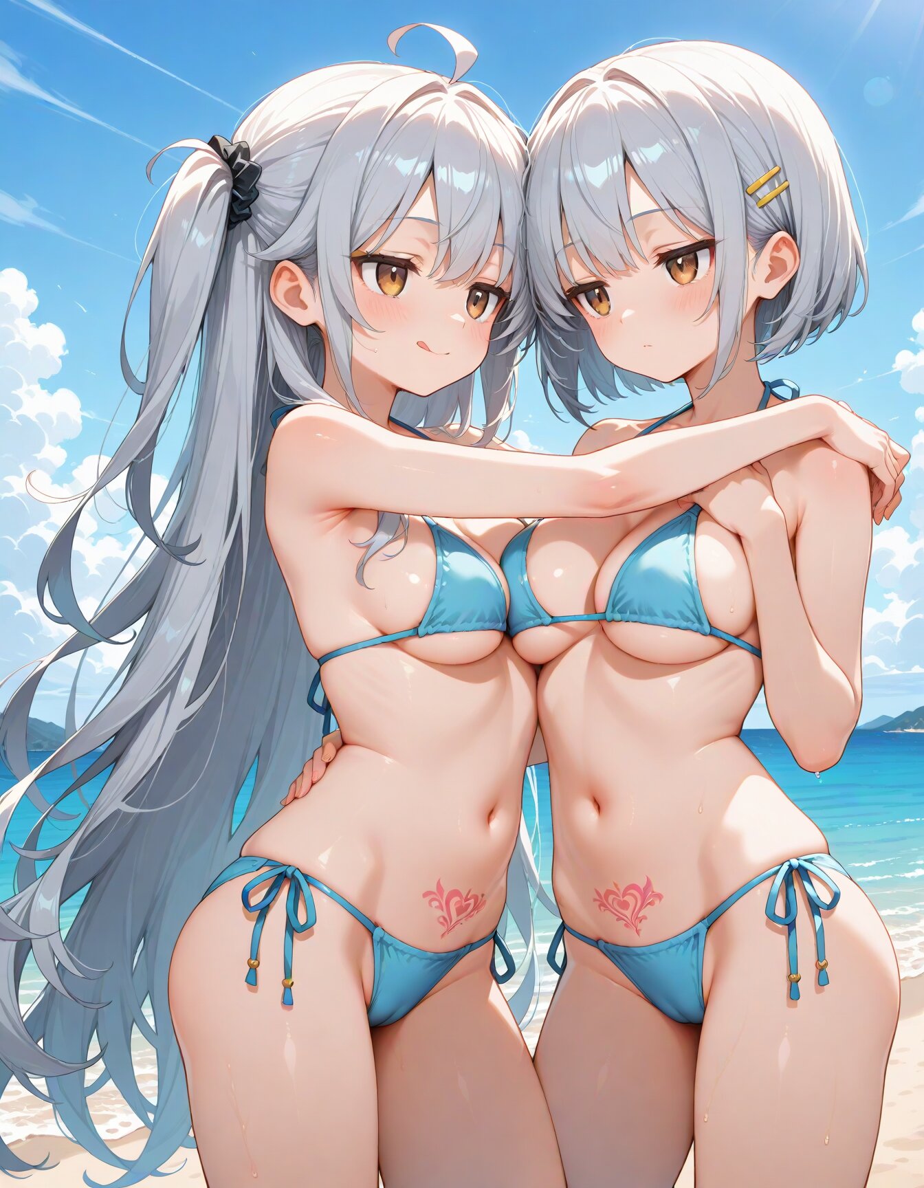 Masterpiece, best quality, high quality, ultra-detailed, ultra-high resolution, best beauty 8K, BREAK, 2girls, side by side, yuri, hug, 18 yo, hairclip, smile, blush, brown eyes, sandy beach, sea, along the coast, eye contact, (light blue bikini, sideboob,underboob, string bikini, side-tie bikini, cameltoe:1.3), contrapposto, holding hands, both hands on chest, cowboy shot, stomach, (crotch tattoo, tattoo on underbelly), BREAK, 2girls, jitome, ahoge, bob cut hair, gray hair, large breasts, BREAK, 2girls, jitome, ahoge, long hair, side ponytail, gray hair, medium breasts