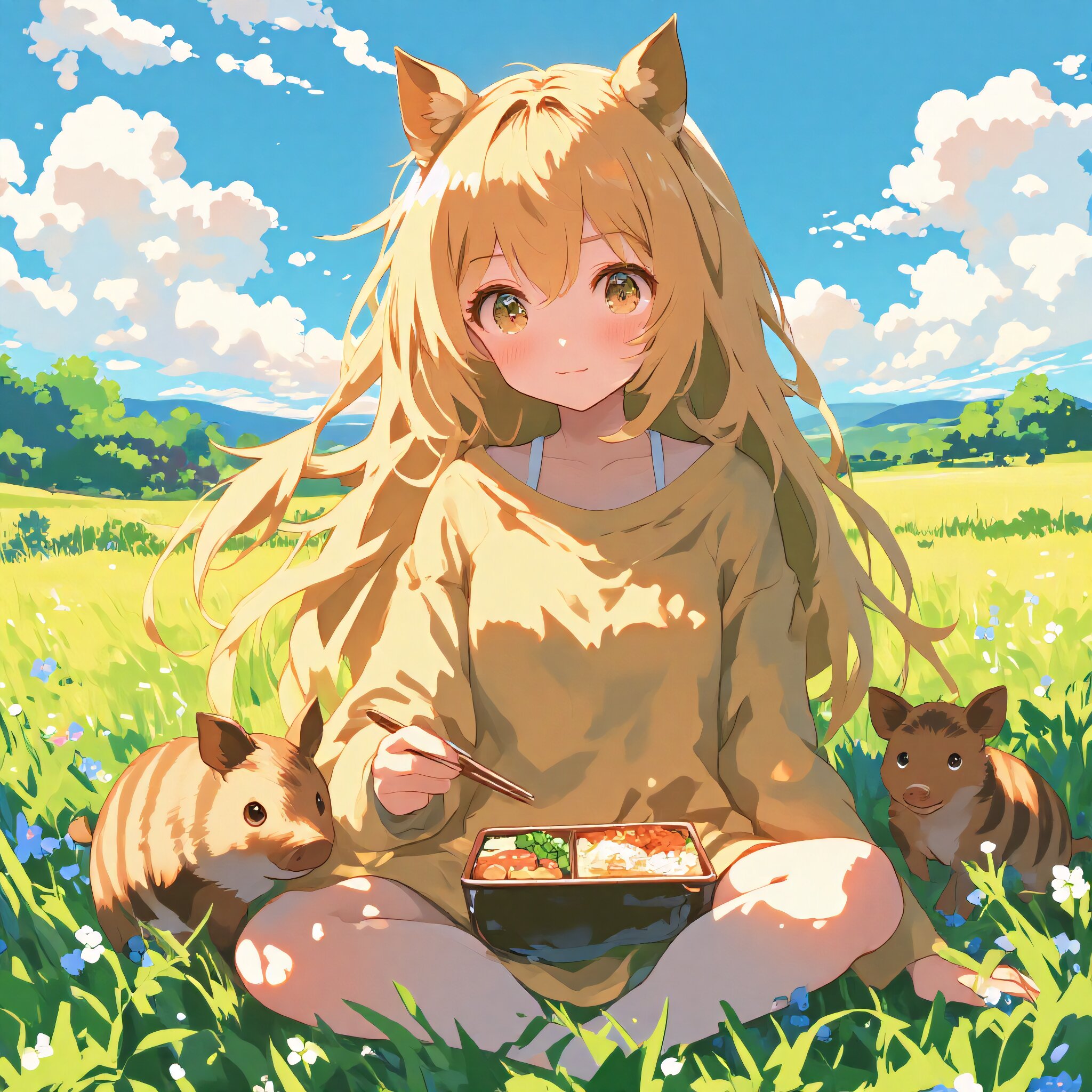 "An anime-style boar-eared girl sitting in a vibrant, sunlit meadow, enjoying a peaceful lunch with a bento box. She has long, flowing light-brown hair that shimmers in the gentle breeze, and her boar-like ears perk up slightly as she relaxes with a serene smile. Beside her, a small and playful baby boar (うりぼう) nuzzles close, its striped fur glinting softly under the sunlight, adding a touch of innocence and charm to the scene. Her outfit is a simple yet cozy casual dress, blending earthy tones and soft fabrics, perfectly suited for a tranquil countryside setting. The background showcases a lush green field dotted with colorful wildflowers, a distant blue sky filled with fluffy clouds, and soft hills stretching beyond, creating a harmonious and picturesque moment. Highly detailed, warm and natural tones, blending serenity, charm, and boar-like uniqueness."