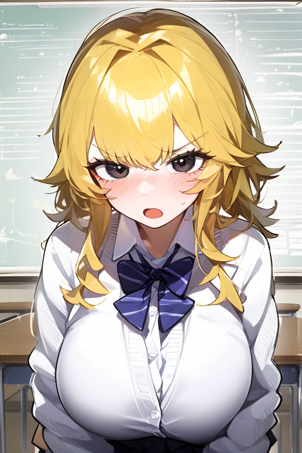 absurdres,detailed and intricate, (best quality),solo,1girl,17yo,brush,(frown),open mouth,leaning forward, (tsundere:1.3), huge breasts, school uniform, beige cardigan,super beautiful,extremely detailed, BREAK,school,classroom, BREAK,(blond hair),middle curl hair, BREAK,(black eye),makeup,