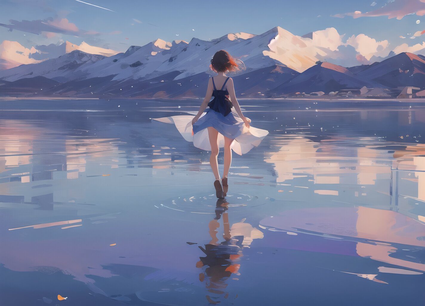 Uyuni salt lake,water only, reflection, walking motion,sundress,sunlight,panorama,blue sky,day, BREAK,absurdres, (best quality),super beautiful,,extremely detailed, BREAK,solo,(1 girl), BREAK,Elegant hair, BREAK,beautiful eyes,vibrant eye,beautiful and delicate eyes, BREAK,clear face,