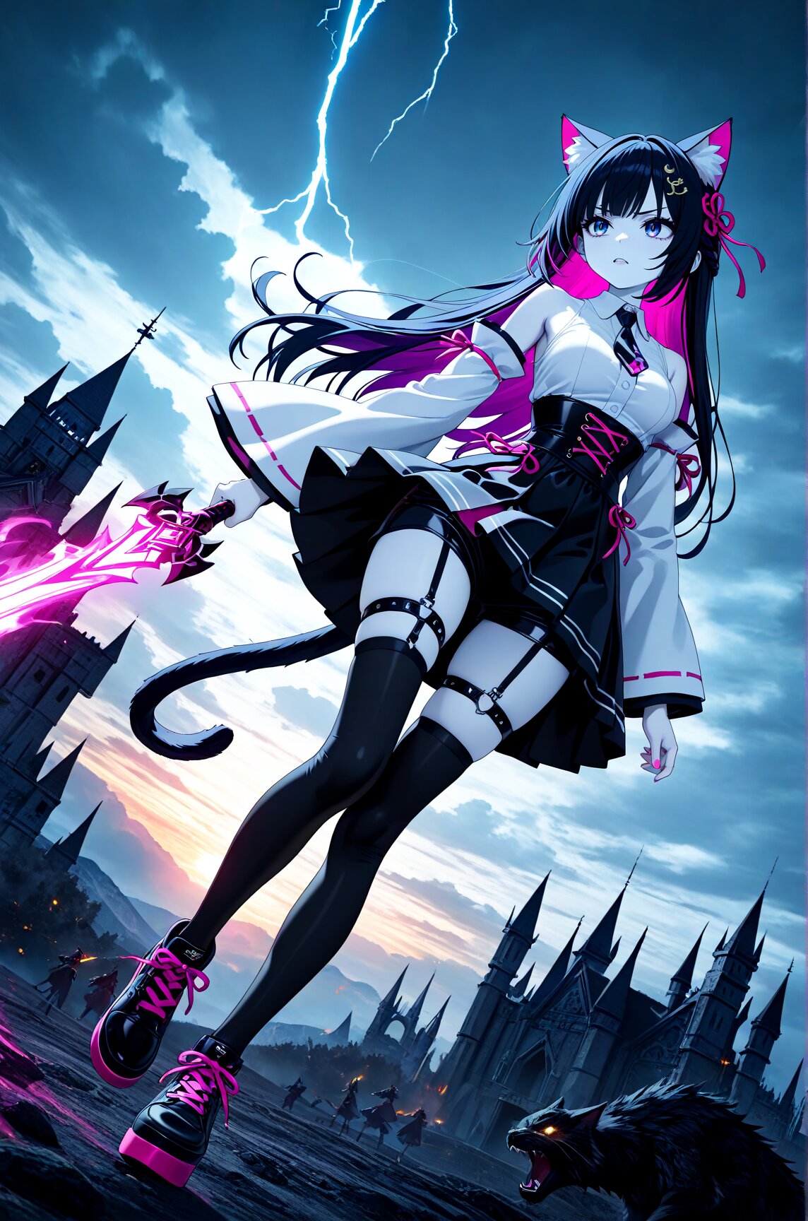 Anime illustration, CG art, 3D model, 3D rendering, 3D skin texture, high detail, depth of field, 1 person, cat ears, cat tail, hime cut, side ponytail, slanted eyes, sky blue eyes, white skin, gothic lolita, 8K, masterpiece, best quality, amazing quality, very aesthetic, (volumetric lighting), overexposed,