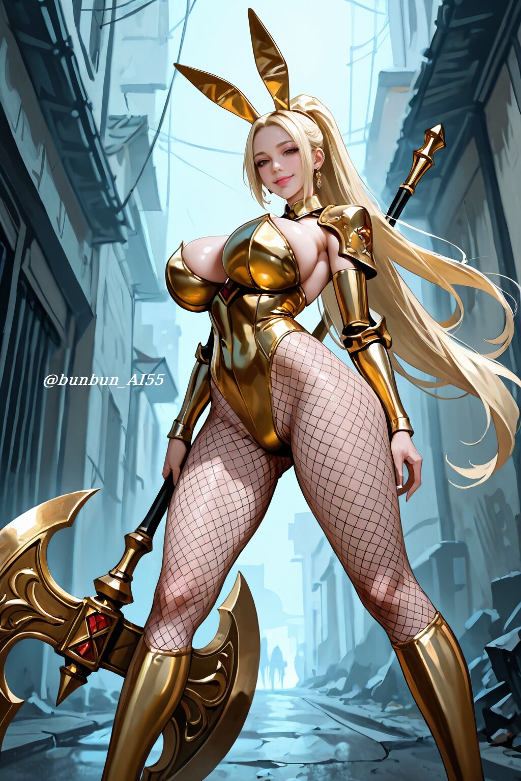HDR, 8K,masterpiece, best_quality, amazing quality, very aesthetic, absurdres, newest, detailed eyes, realistic eyes, realistic body,(realistic, hyperrealistic), highres, detailed illustration, movie style, fantasy art, BREAK perfect lighting, professional lighting, (1girl, beautiful female knight, 18year old), (kawaii, idol), (slim face, small face, cute face, detailed face, brown eyes, makeup), (looking at viewer, seductive smile), (blonde hair, very long ponytail), (jewelry, piercing, earrings, pink lips), (rabbit ears) nsfw, (huge breasts, pointy breasts), long legs, (perfect hands), (shiny skin), (athletic body), (wearing a gold fantasy-style highleg bunny girl suit), (silver fantasy armor on arms and shoulders and thighs and legs, fantasy ornate armor details), (fishnet pantyhose), (light reflections), (shiny, glossy, luster), (standing, legs apart, dynamic pose), (holding a giant battle axe, battle-ready pose), (detailed background, standing in an empty dark alley with moonlight), (from side | straight-on), (bust-up shot, medium shot, dynamic angle, dutch angle),