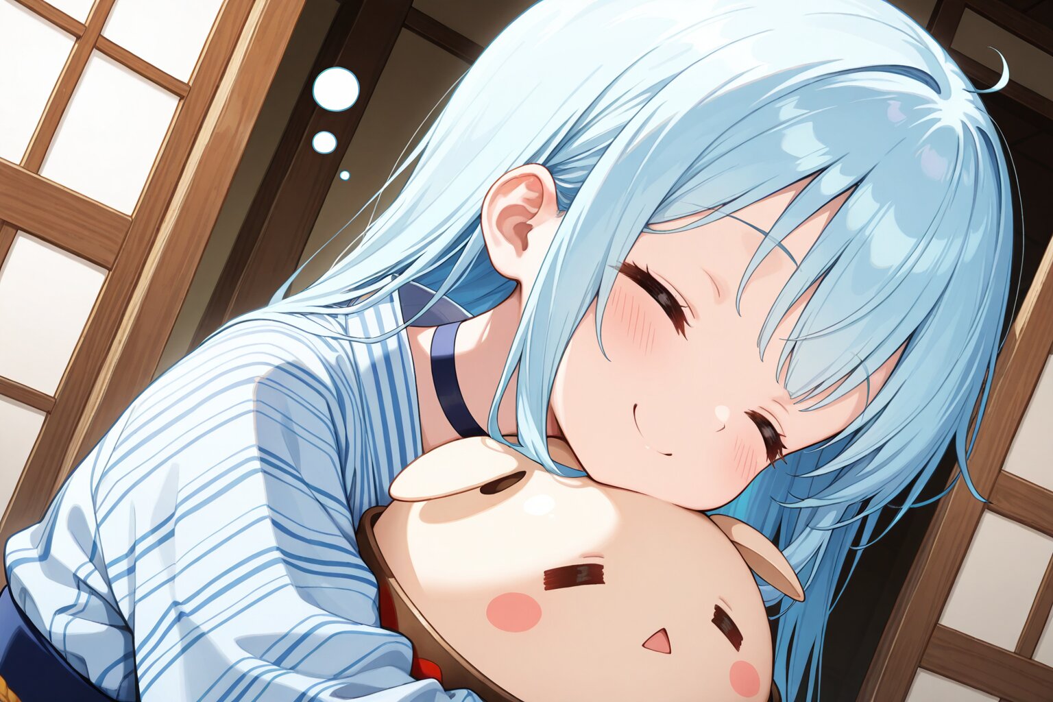 1 little girl, solo, diagonal angle, upper body, masterpiece, best quality, amazing quality, very aesthetic, sky blue hair, long hair, straight hair, closed eyes, =_=, chestnut mouth, smile, mouth, cheerful, relaxing, Squeans, spoken Squeans, choker, yukata, on back, futon, hugging humpty dumpty, in japanese room, spring,