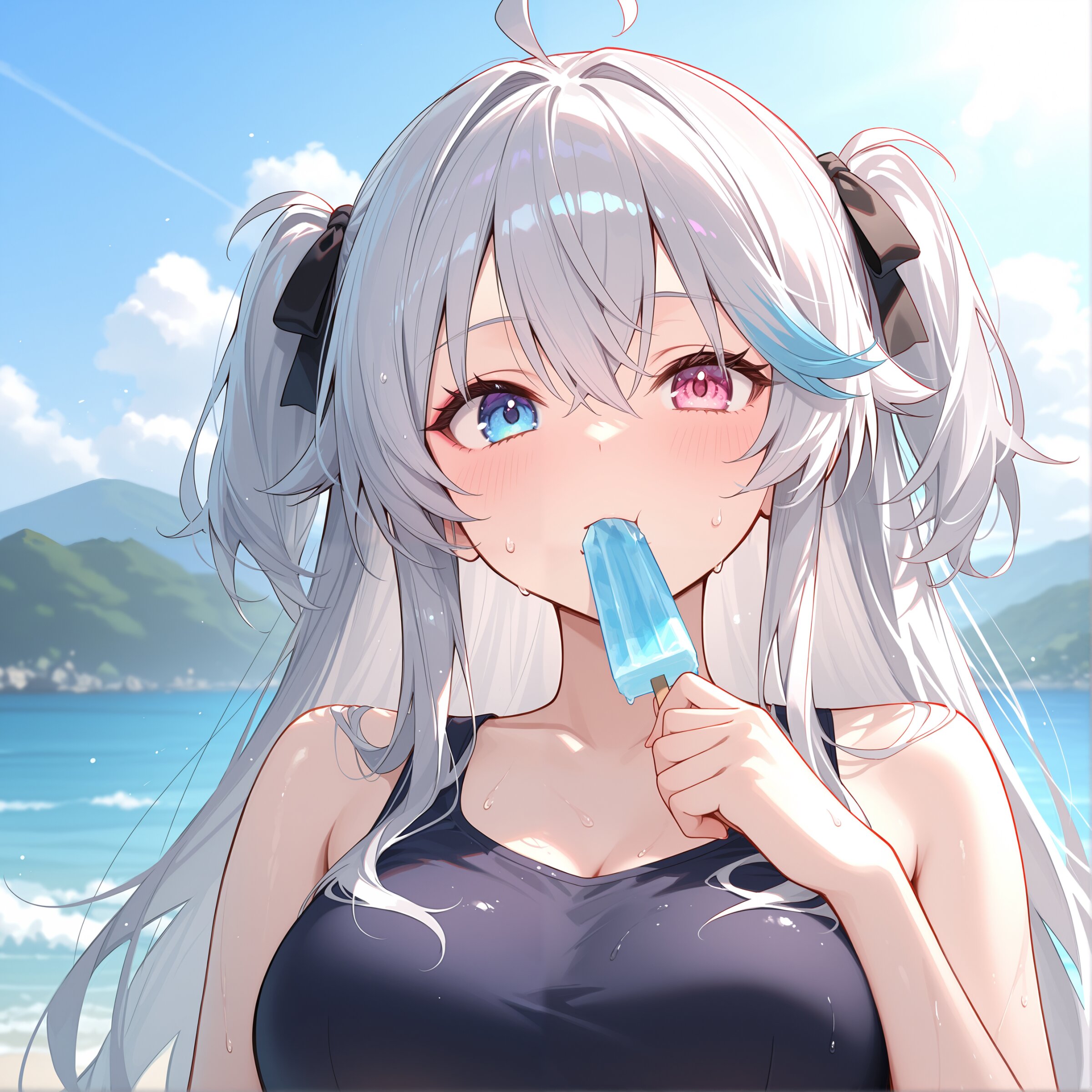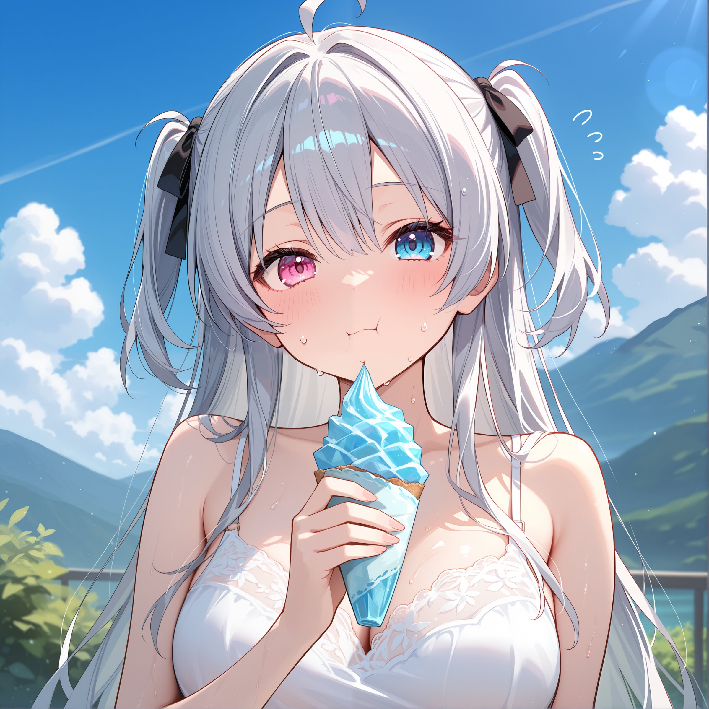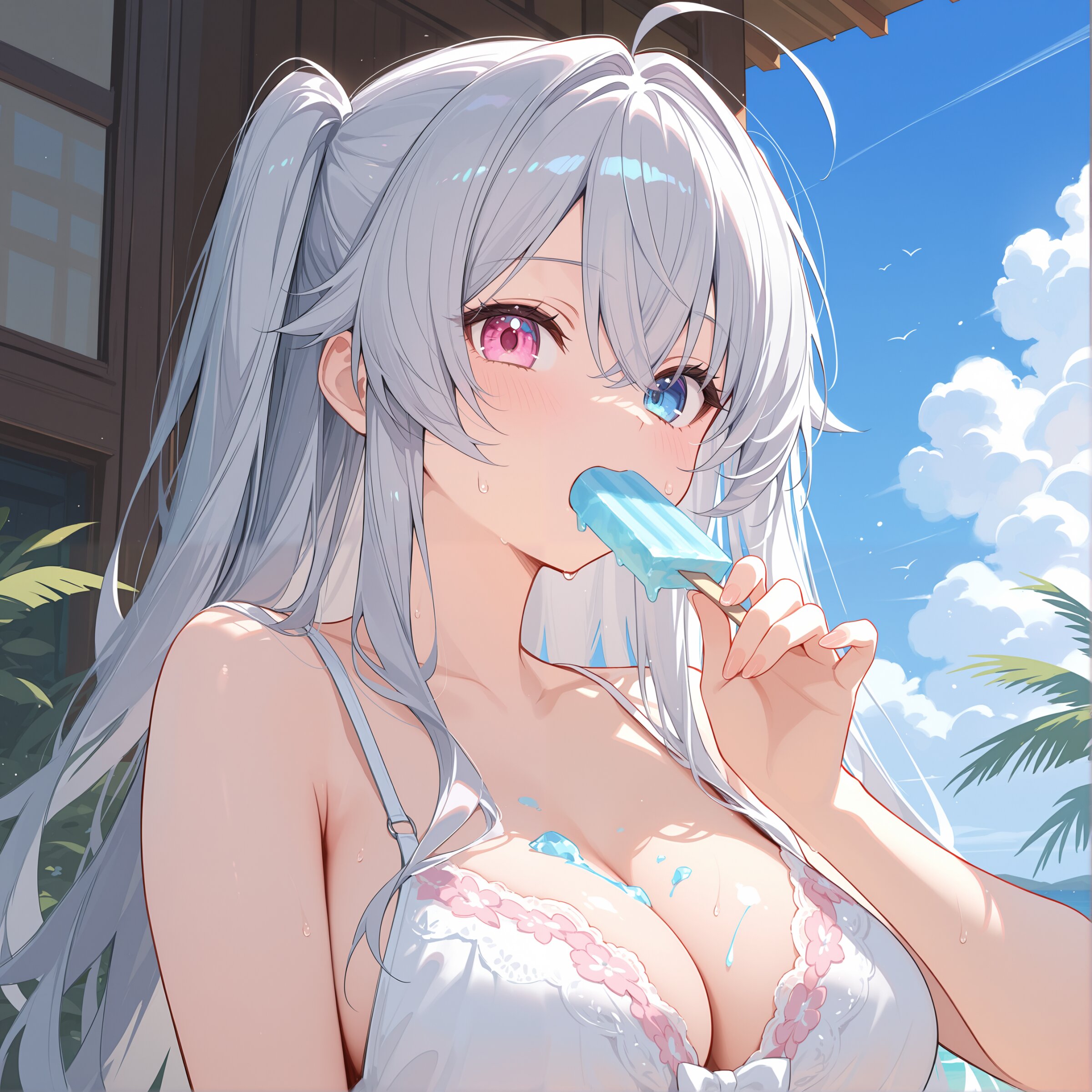 rating explicit, medium large breasts,silver hair,long hair,two side up,ahoge,, whiteplain T-shirt, oversized shirt, face focus,outdoors,cinematic scene, sweatdrop, hot, ice, eating,ice masterpiece,best quality,intricate detail,absolutely resolution,8k,newest,hand-drawn style, sketch,