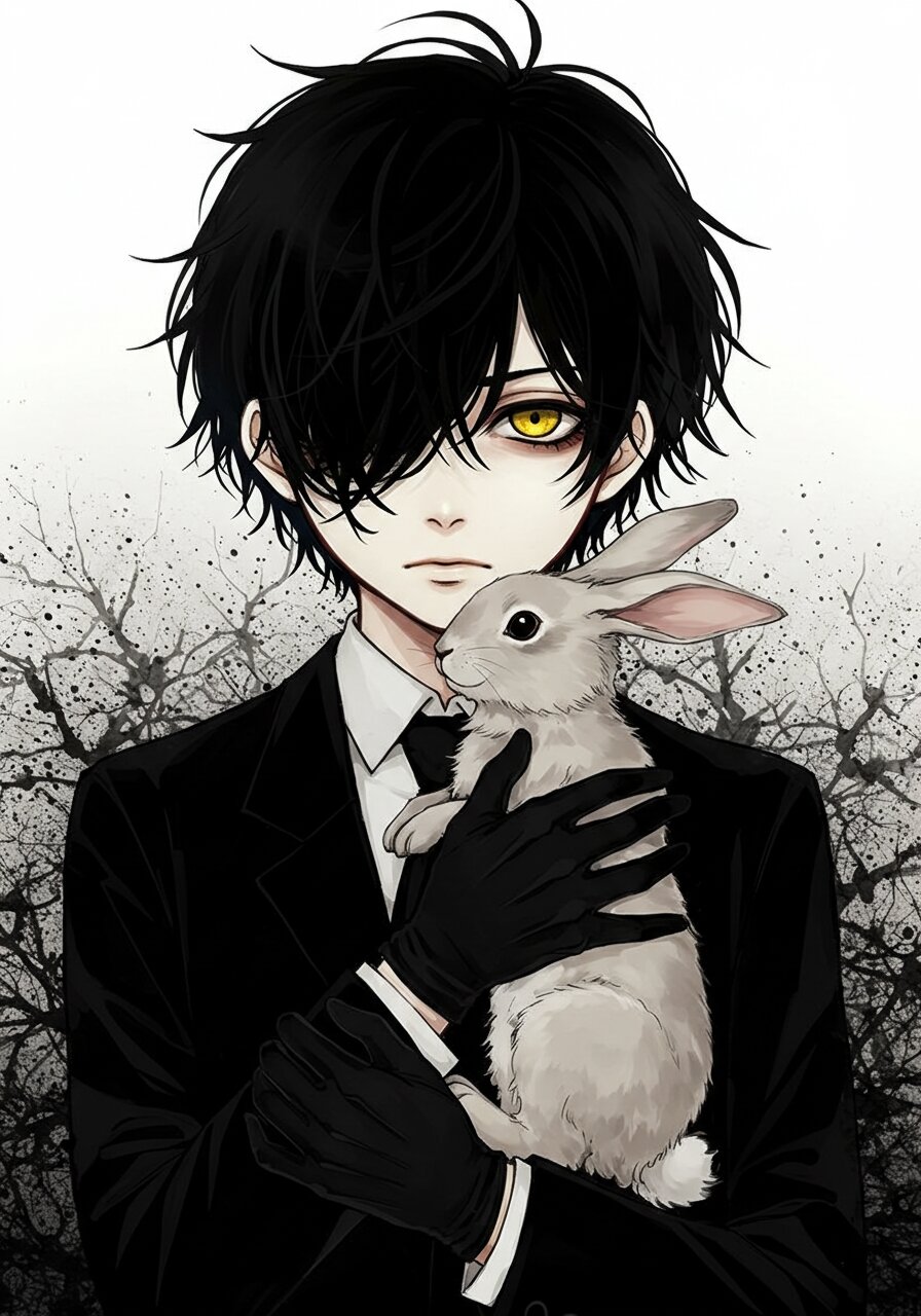 A realistic illustration of a boy with black hair, with hair completely covering one of his eyes, yellow eyes, wearing a black suit and black gloves, with a serious and expressionless face, gently holding a rabbit in his arms.