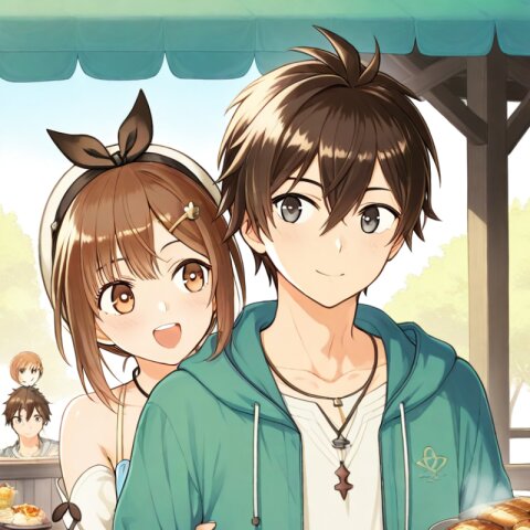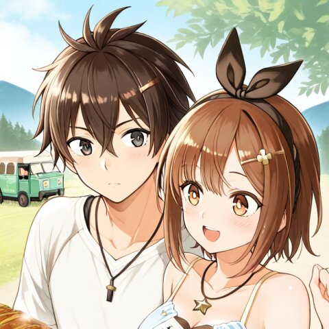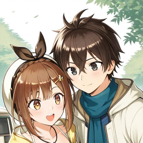 Couple, boy and girl, two people only,absurdres, ultra-detailed, master piece, high resolution, 8k, Boy, girl, couple, On a hot spring afternoon in late April, a man and a woman spend a peaceful moment in the shade of a quiet park. The man, sketchbook in hand, pencil gliding, draws a picture of a woman sitting on a bench as a model. The woman, dressed in a light one-piece dress, her hair swishing in the spring breeze, her ears tucked behind her, gazes at the man with a soft smile. Her cheeks are faintly red from the spring sunlight and the glow of the sun. The man faces his sketchbook with serious eyes, occasionally glancing at the woman's face and smiling back. In the background are fresh green trees, falling cherry petals, and birds chirping in the distance. The woman's figure gradually takes shape on the paper of the sketchbook, and the quiet trust and intimacy that flows between them deepens with the warmth of spring. BREAK the boy(original boy,black hair,short hair, black eyes) BREAK the girl(suguha, short hair, hairclip, large breasts,, )