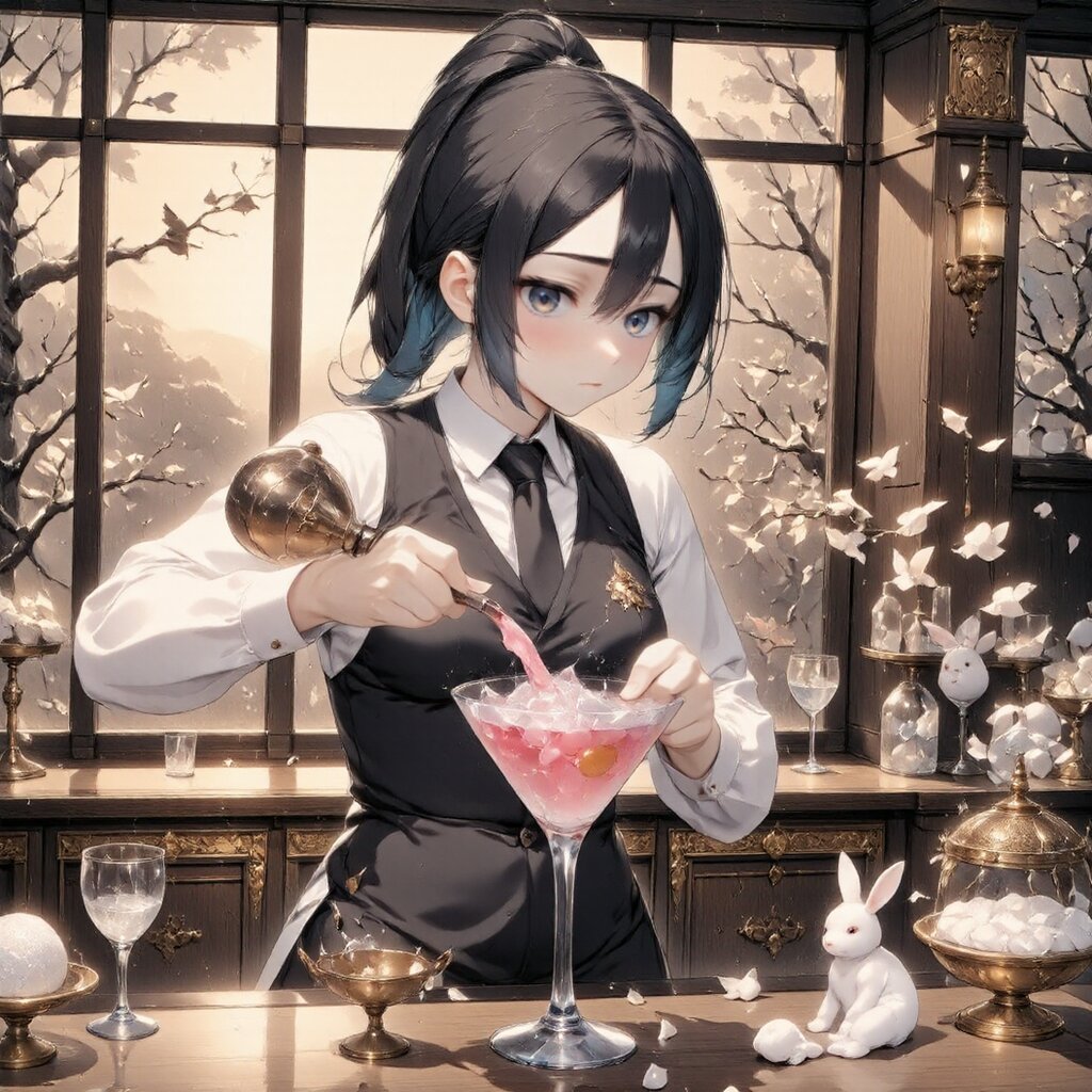 [Opening Scene Description] In an elegant Japanese bar at dusk, a professional female bartender (aikawa-tsukiko slender woman age 27, 165cm) is performing a precise cocktail shaking technique with a standard 28oz silver shaker decorated with subtle Easter egg patterns. The shaker catches the soft pink evening light filtering through cherry blossom branches outside, while a delicate mist of sakura essence escapes with each rhythmic movement. [Character and Environment Details] She wears a crisp white shirt with rolled-up sleeves, black vest with subtle pastel pink embroidery, and a professional black tie, which accentuates her poised elegance. The bar features polished wooden counters decorated with petite vases of fresh cherry blossoms, properly-sized 6oz cocktail glasses with delicate pastel pink salt rims, and miniature Easter decorations like small origami rabbits and egg-shaped tea light holders that blend Japanese and Western spring traditions. [Character Specifics] Black hair with midnight blue highlights tied in a neat ponytail, sharp blue eyes showing characteristic tiredness yet focus, pale skin with translucent quality, thin lips with natural downward tilt, elegant hands with long fingers, perfect posture, professional poise, concentrated expression, sophisticated aura, cool beauty, masterful shaking technique with proper grip and wrist action. [Mood and Atmosphere] The scene captures the ephemeral beauty of spring celebrations, emphasized by the pastel pink and lavender hues of the sunset light reflecting off appropriately-sized glassware. The cocktail appears to transform as it's poured into a 6oz coupe glass, creating layers of pink, white, and pale purple reminiscent of Easter eggs and cherry blossoms. The overall effect suggests the perfect harmony between traditional Japanese sakura season and Western Easter celebrations.