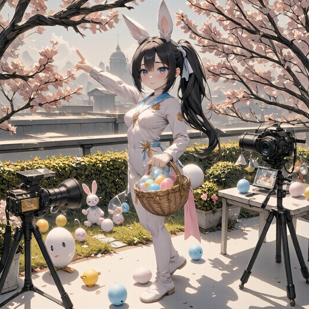 [Opening Scene Description] On a rooftop garden blooming with cherry blossoms, an energetic young woman (jozaki-hina slender woman age 22, 166cm) is striking a playful pose in an anime character cosplay outfit enhanced with Easter bunny elements. She is holding a professionally decorated Easter basket filled with colorful eggs while several smartphones and cameras on tripods are set up around her. The garden is decorated with Easter-themed anime props, including realistic-sized colorful eggs, spring flowers, and small anime figurines wearing bunny ears. [Character and Environment Details] She wears a perfect recreation of a popular anime character's outfit, expertly modified with Easter elements including pastel pink and blue ribbons, a small bunny tail, and fluffy white bunny ears that complement her distinctive right side ponytail. The rooftop garden features blooming cherry trees, Easter decorations in anime style, and a professional photography setup with proper lighting reflectors. A small table holds her cosplay accessories, makeup touch-up kit, and a tablet displaying reference images of the character in various poses. [Character Specifics] Dark brown hair in right side ponytail with pastel decorations, cat-like upturned eyes showing excitement, energetic expression, youthful appearance with a bright smile, model-like proportions in a detailed anime character cosplay enhanced with Easter elements, animated gestures, enthusiastic personality, social media savvy posing with professional confidence, excited about capturing the perfect shot for her followers. [Mood and Atmosphere] The scene captures the perfect harmony between Japanese anime culture, spring cherry blossoms, and Western Easter traditions. Natural sunlight filters through the pink cherry blossoms, creating ideal lighting conditions for photography and highlighting the pastel colors of her costume. Several prop