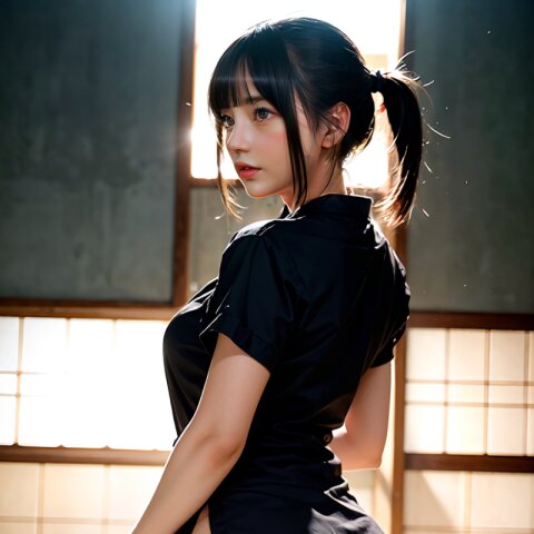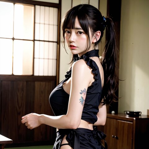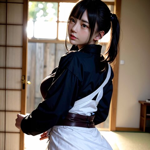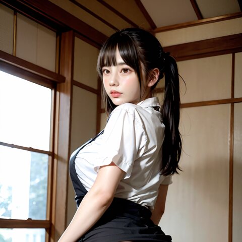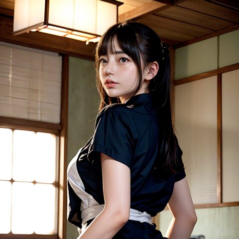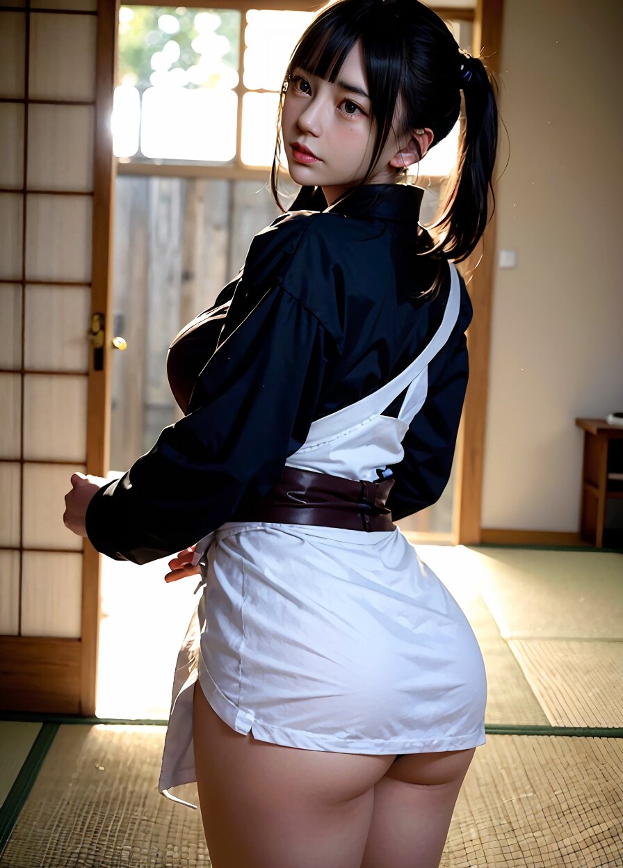 from back, (8k, best quality, masterpiece:1.4), (realistic, photo-realistic:1.6), HDR, (incredibly absurdres:1.2), (vibrant color:1.2), ultra-detailed, random pose, 1girl, 16 years old, student, twintails, (japanese wafuku, apron: 1.6), mini skirt, (slender: 1.4), (huge breasts, big ass:1.5), beautiful detailed face, (cowboy shot: 1.6), perfect skin, detailed skin texture, looking away, (standing: 1.4), (dark daylight: 1.6), in the old japanese living room, <lora:mi_v01:0.6>