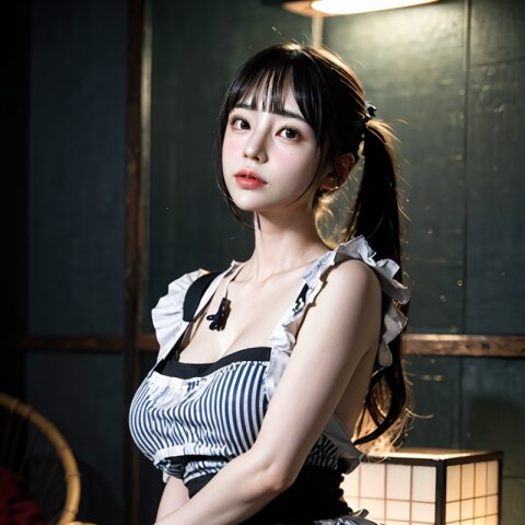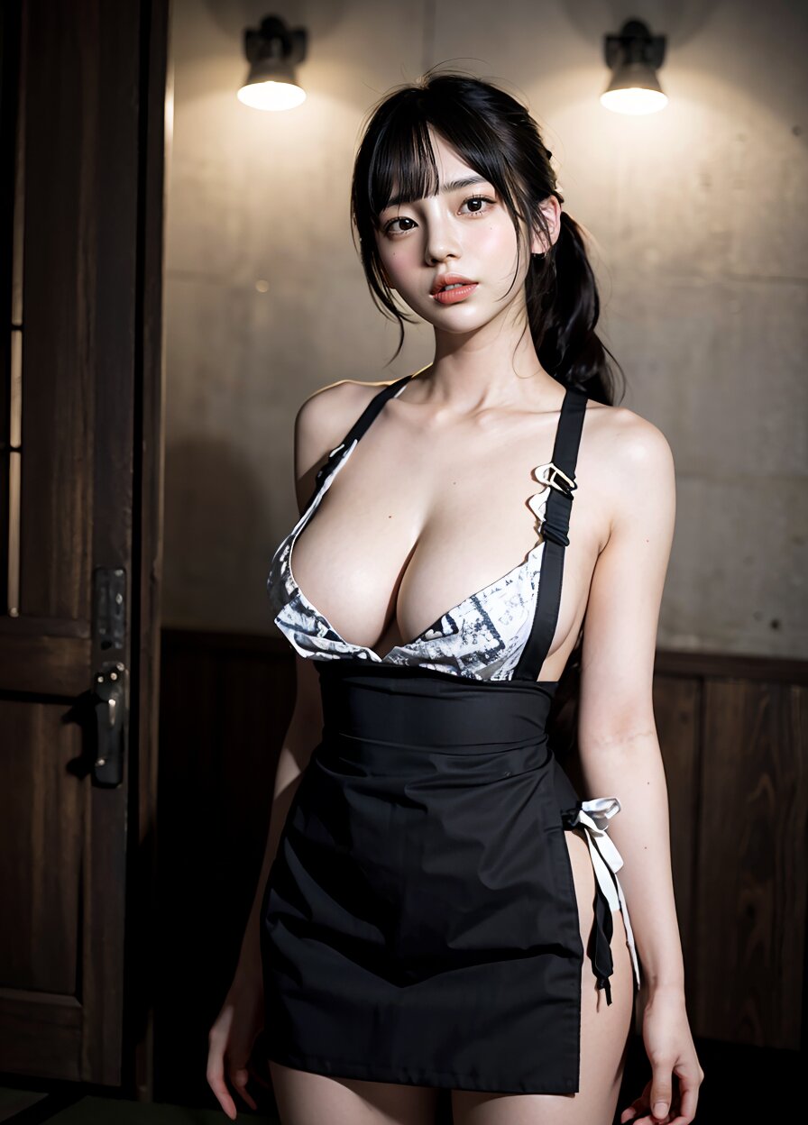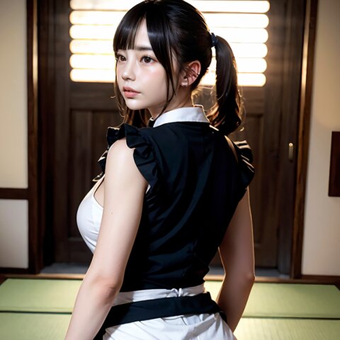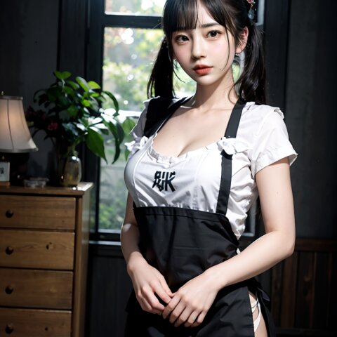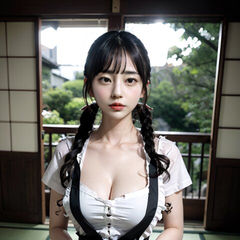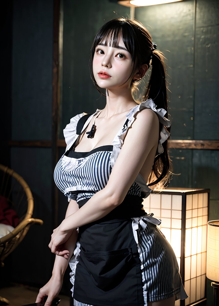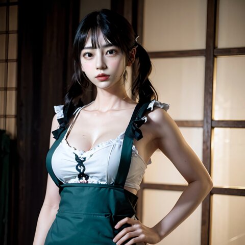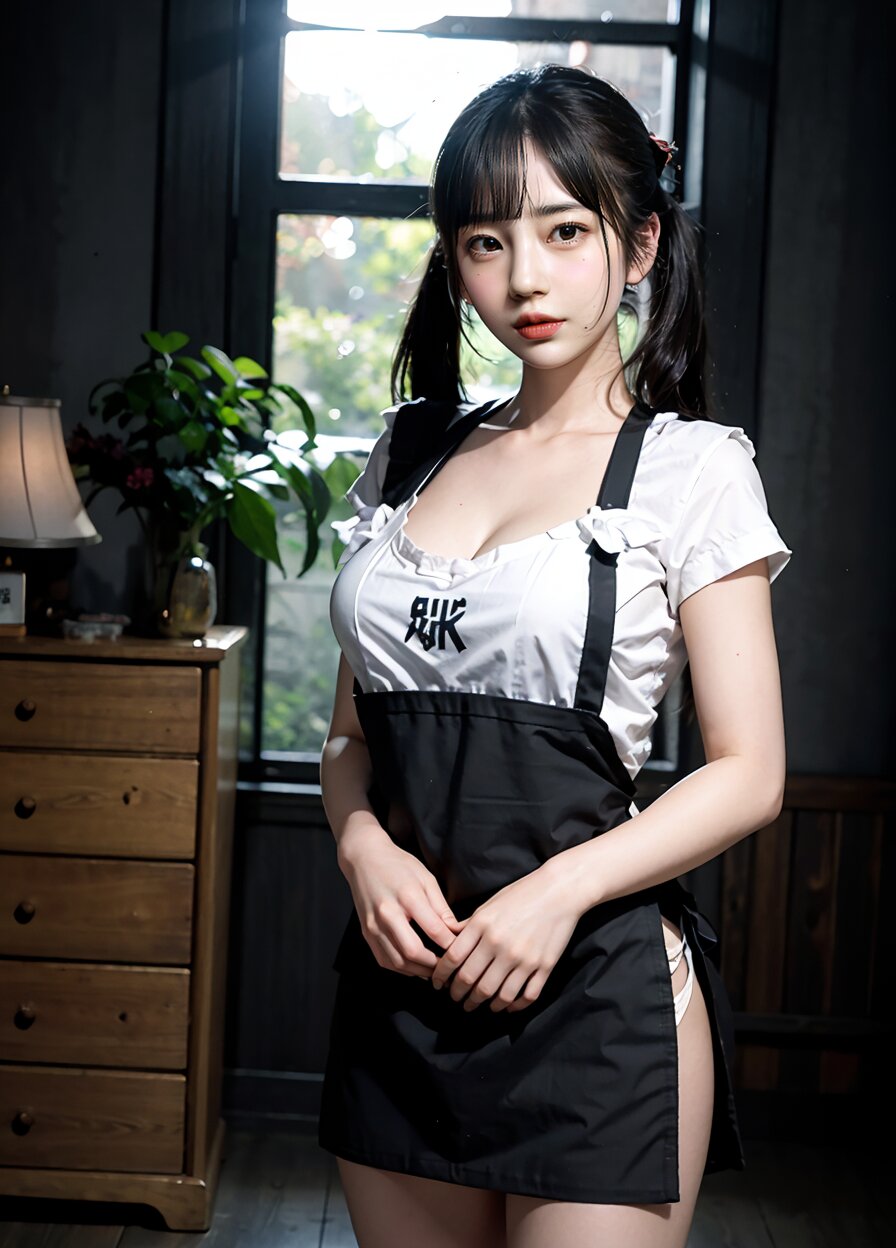 from front, (8k, best quality, masterpiece:1.4), (realistic, photo-realistic:1.6), HDR, (incredibly absurdres:1.2), (vibrant color:1.2), ultra-detailed, random pose, 1girl, 16 years old, student, twintails, (japanese wafuku, apron: 1.6), mini skirt, (slender, huge breasts:1.6), beautiful detailed face, (cowboy shot: 1.6), perfect skin, detailed skin texture, looking away, (standing: 1.4), (dark daylight: 1.6), in the old japanese living room, <lora:mi_v01:0.6>