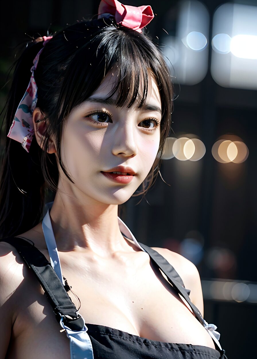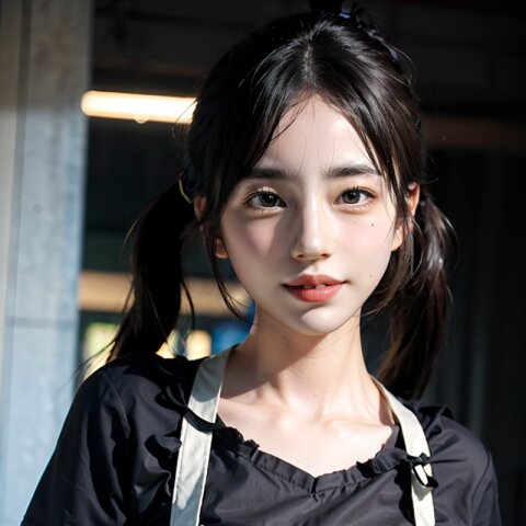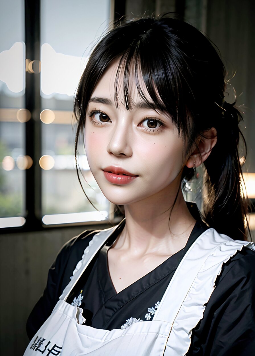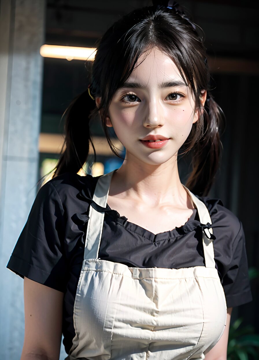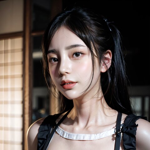 (((from front))), (8k, best quality, masterpiece:1.4), (realistic, photo-realistic:1.6), HDR, (incredibly absurdres:1.2), (vibrant color:1.2), ultra-detailed, 1girl, 16 years old, student, twintails, (japanese wafuku, apron: 1.6), mini skirt, (slender, huge breasts:1.6), beautiful detailed face, (upper body, closeup face: 1.6), perfect skin, detailed skin texture, (looking at viewer: 1.6), (standing: 1.4), (dark daylight: 1.6), in the old japanese living room, <lora:mi_v01:0.6>