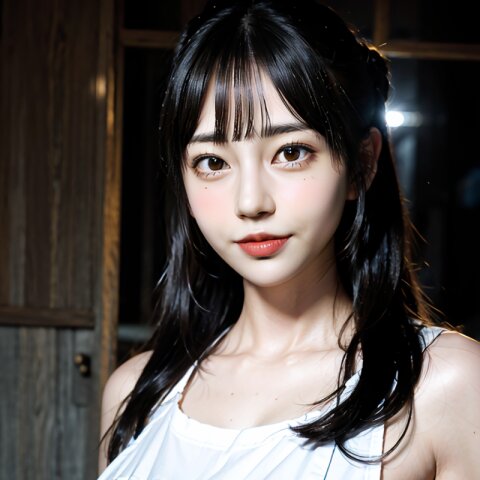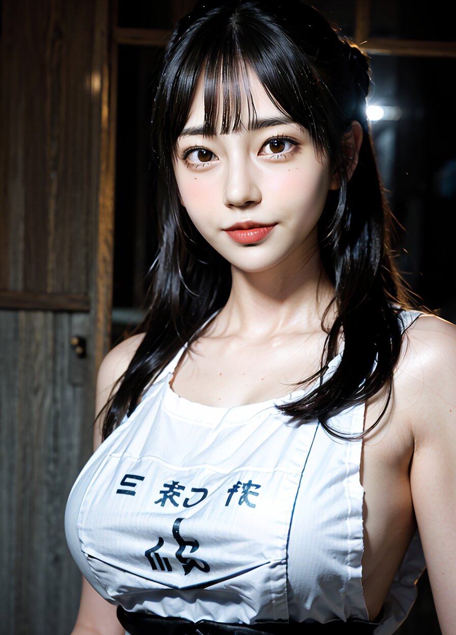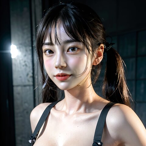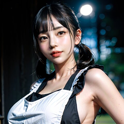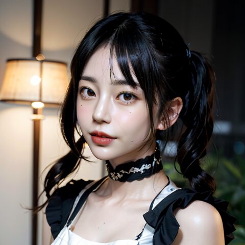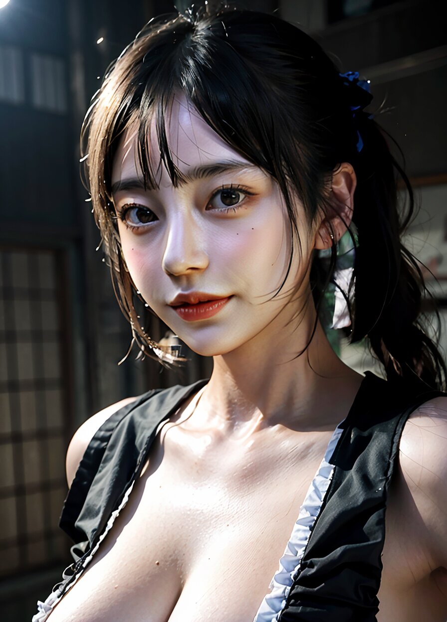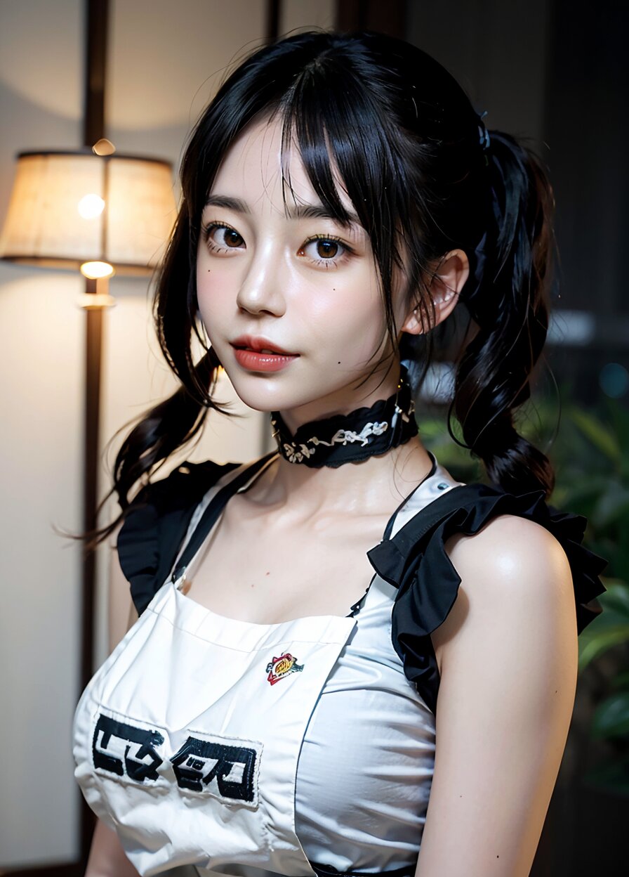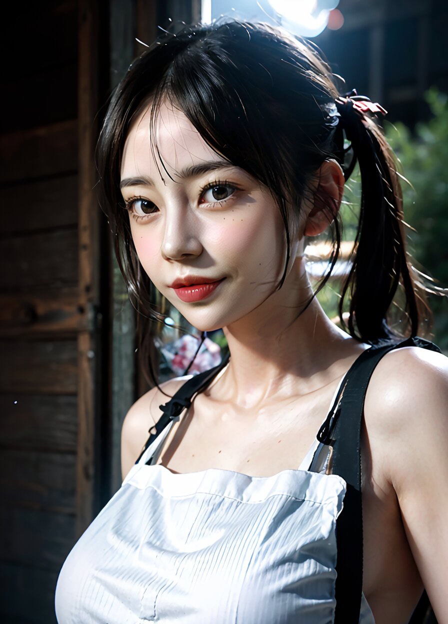 (((from front))), (8k, best quality, masterpiece:1.4), (realistic, photo-realistic:1.6), HDR, (incredibly absurdres:1.2), (vibrant color:1.2), ultra-detailed, 1girl, 16 years old, student, twintails, (japanese wafuku, apron: 1.6), mini skirt, (slender, huge breasts:1.6), beautiful detailed face, (upper body, closeup face: 1.6), perfect skin, detailed skin texture, (looking at viewer: 1.6), (standing: 1.4), (dark daylight: 1.6), in the old japanese living room, <lora:mi_v01:0.6>
