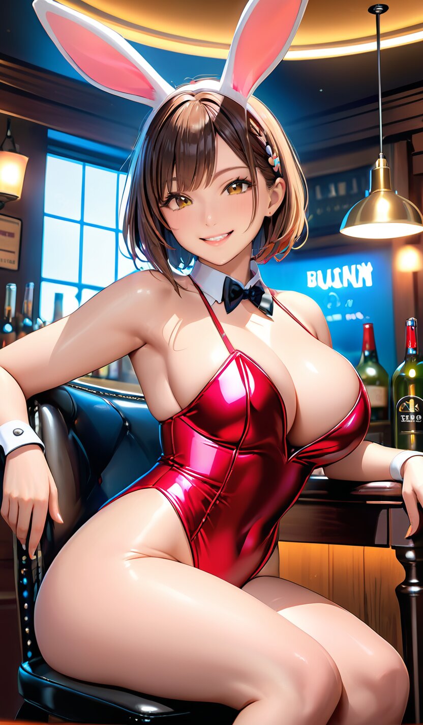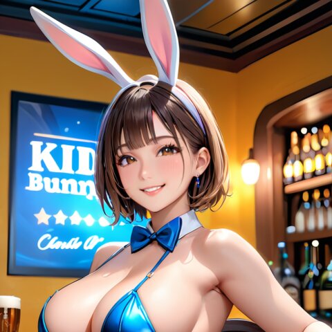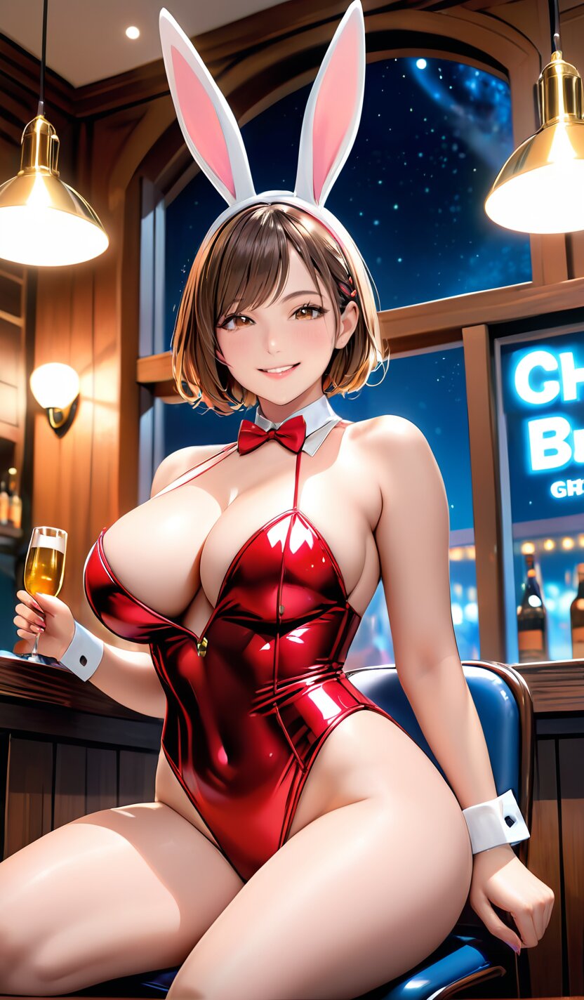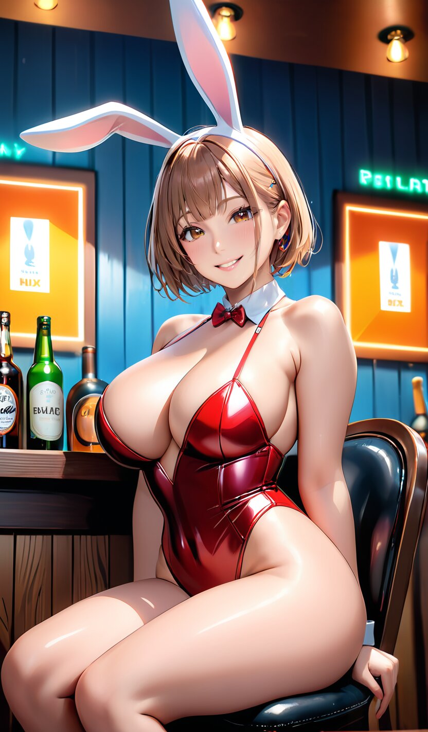 random angle, (8k, best quality, masterpiece:1), (realistic, photo-realistic:1.4), HDR, (incredibly absurdres:1.2), (sexy pose: 1.6), 1woman, 28 years old, (((bunny girl))), perfect anatomy, slender, huge breasts, beautiful detailed face, (cowboy shot: 1.6), perfect skin, detailed skin texture, short hair, looking aside, (sexy bunny girl costume: 1.6), (sitting on chair: 1.6), in the night pub, <lora:mariM_v01:1>