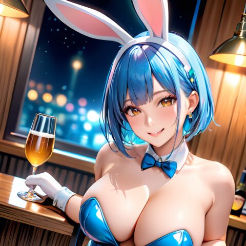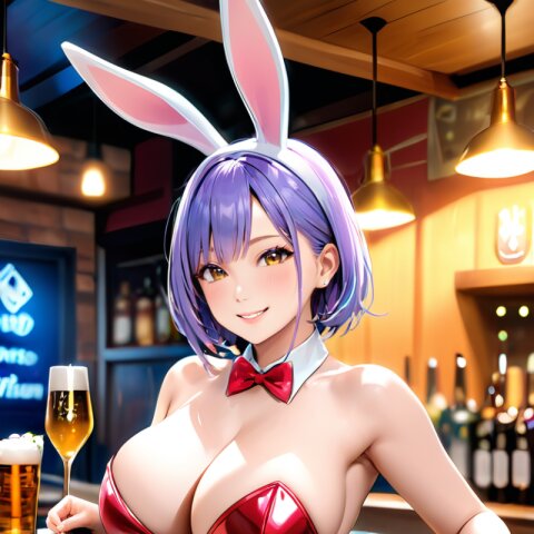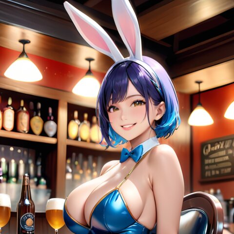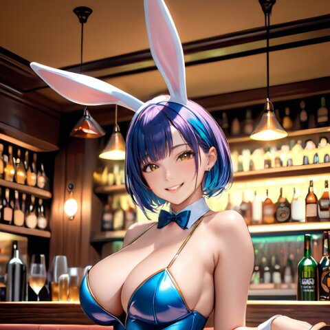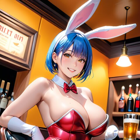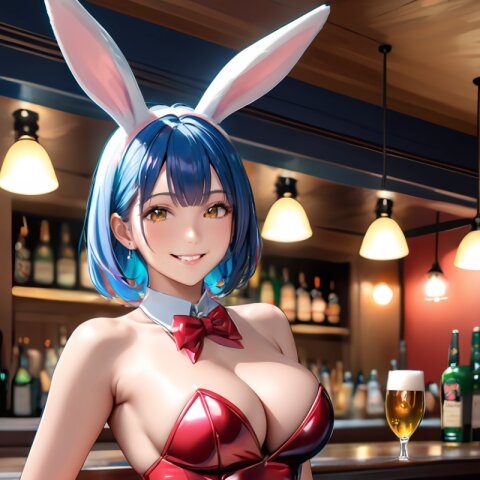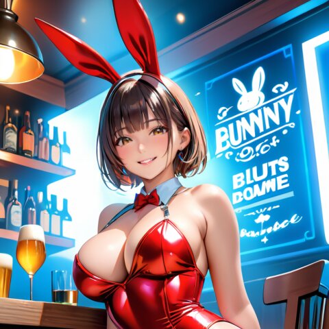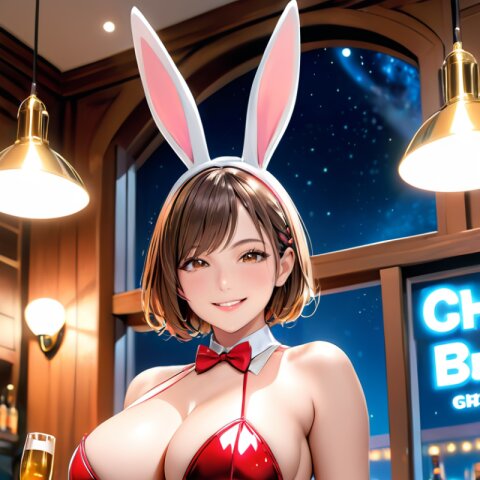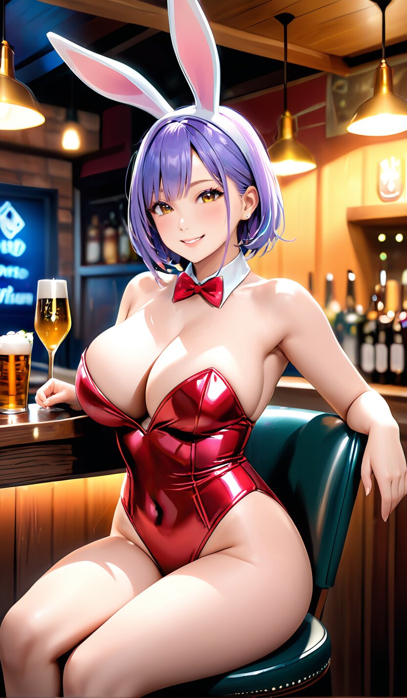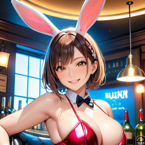 random angle, (8k, best quality, masterpiece:1), (realistic, photo-realistic:1.4), HDR, (incredibly absurdres:1.2), (sexy pose: 1.6), 1woman, 28 years old, (((bunny girl))), perfect anatomy, slender, huge breasts, beautiful detailed face, (cowboy shot: 1.6), perfect skin, detailed skin texture, short hair, looking aside, (sexy bunny girl costume: 1.6), (sitting on chair: 1.6), in the night pub, <lora:mariM_v01:1>