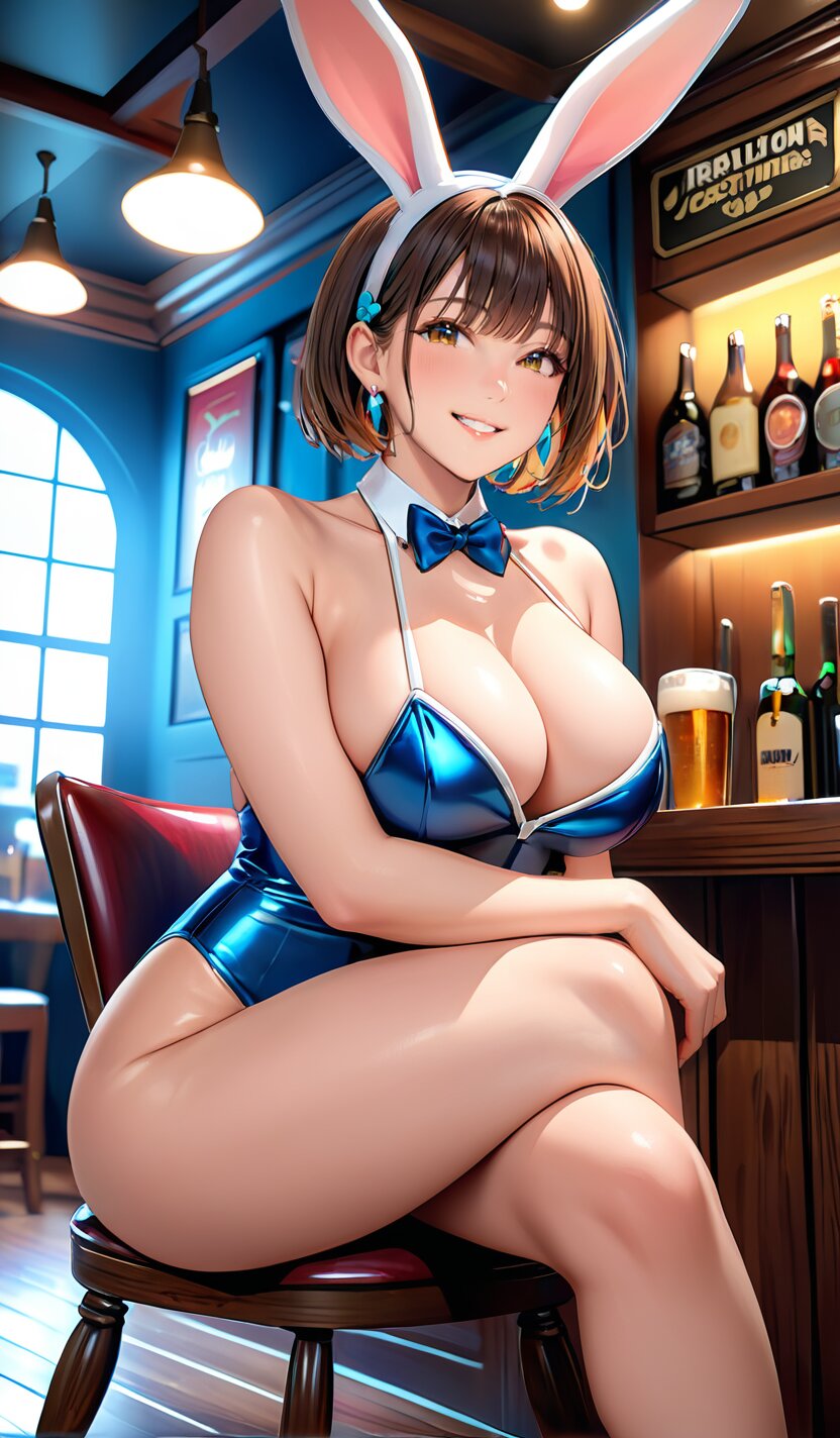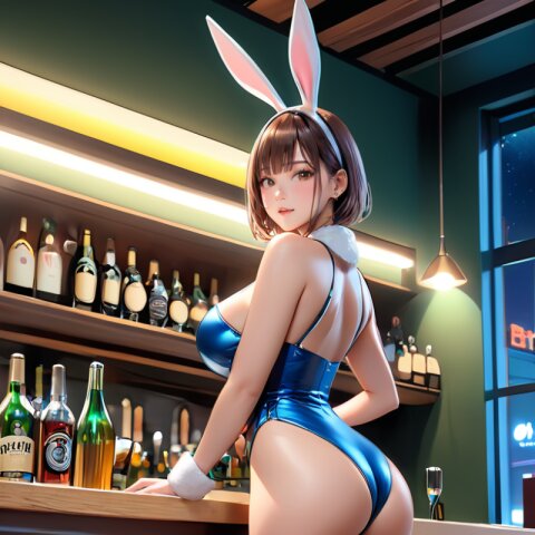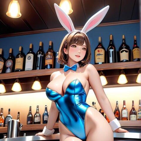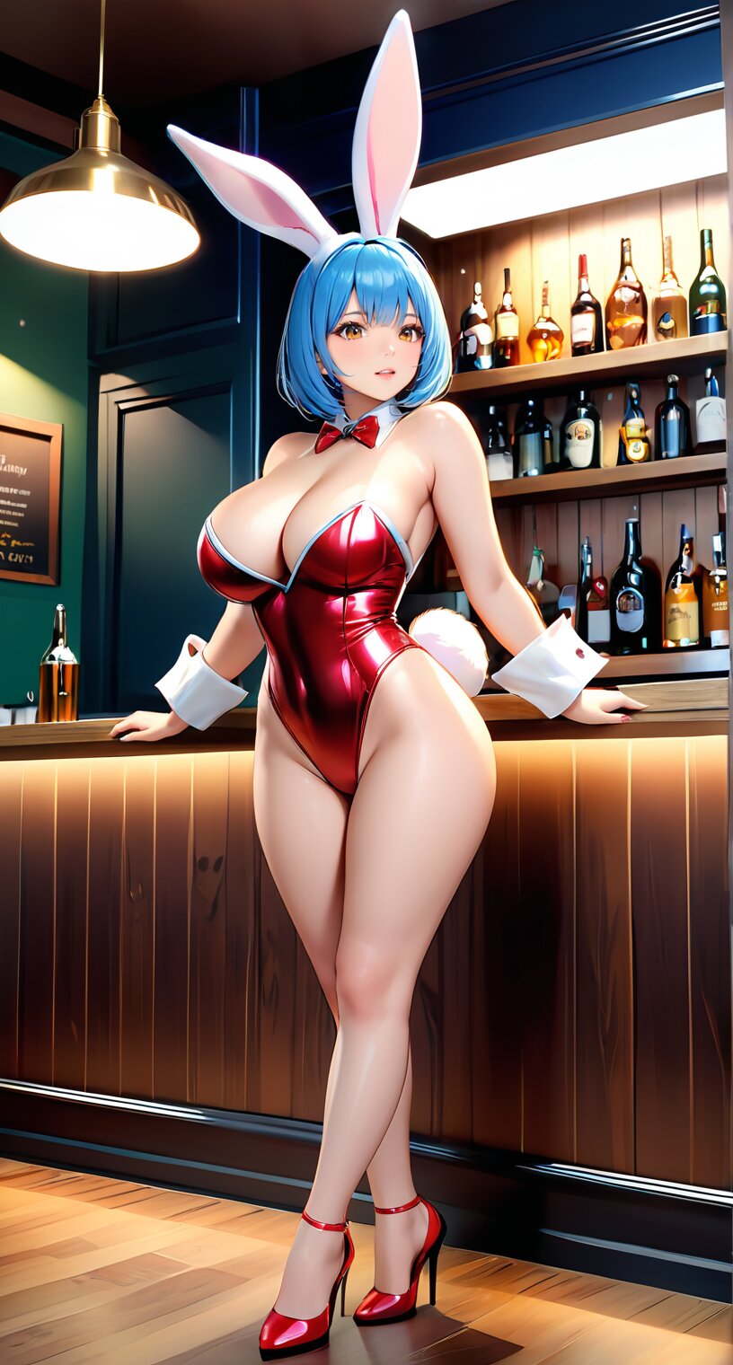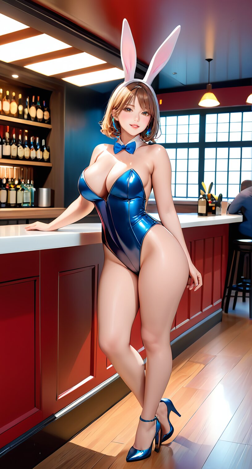 random angle, (8k, best quality, masterpiece:1), (realistic, photo-realistic:1.4), HDR, (incredibly absurdres:1.2), (sexy pose: 1.6), 1woman, 28 years old, (((bunny girl))), perfect anatomy, slender, huge breasts, beautiful detailed face, (full body: 1.6), perfect skin, detailed skin texture, short hair, looking aside, (sexy bunny girl costume: 1.6), (standing next to the counter: 1.6), in the night pub, <lora:mariM_v01:1>