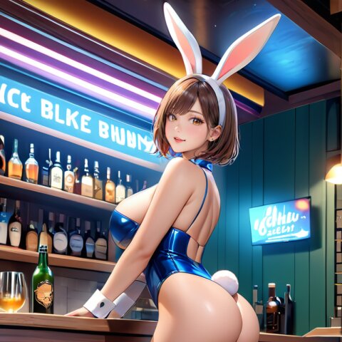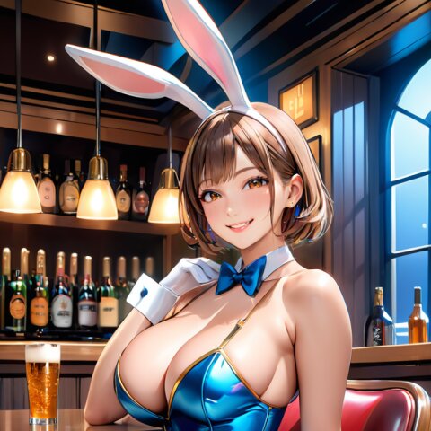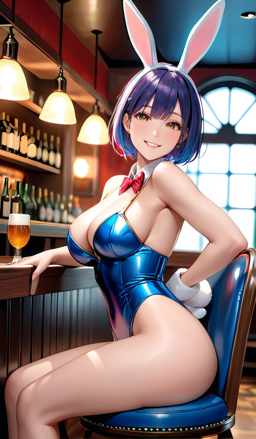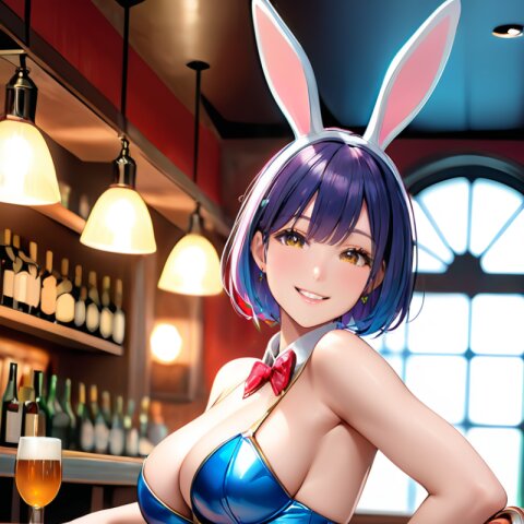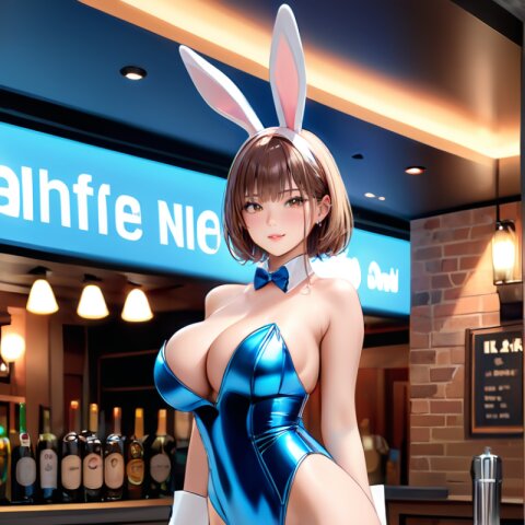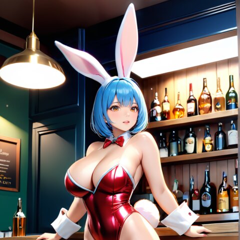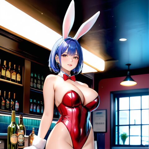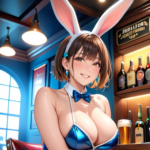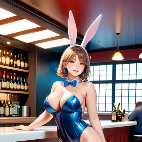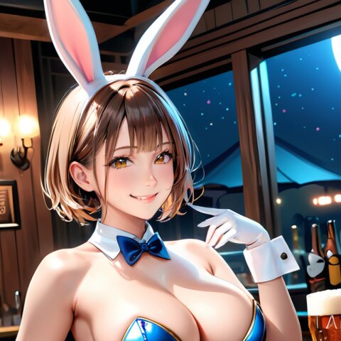 random angle, (8k, best quality, masterpiece:1), (realistic, photo-realistic:1.4), HDR, (incredibly absurdres:1.2), (sexy pose: 1.6), 1woman, 28 years old, (((bunny girl))), perfect anatomy, slender, huge breasts, beautiful detailed face, (full body: 1.6), perfect skin, detailed skin texture, short hair, looking aside, (sexy bunny girl costume: 1.6), (standing next to the counter: 1.6), in the night pub, <lora:mariM_v01:1>