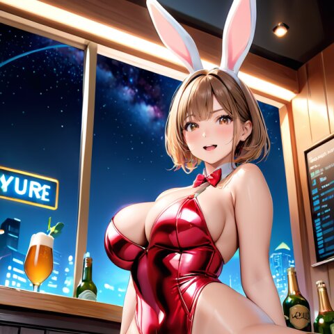 from back, (8k, best quality, masterpiece:1), (realistic, photo-realistic:1.4), HDR, (incredibly absurdres:1.2), (sexy pose: 1.6), 1woman, 28 years old, (((bunny girl))), perfect anatomy, slender, huge breasts, beautiful detailed face, (cowboy shot: 1.8), perfect skin, detailed skin texture, short hair, looking at viewer, (sexy bunny girl costume: 1.6), (standing to the counter, doggystyle, sticking out ass : 1.6), in the night pub, <lora:mariM_v01:1>