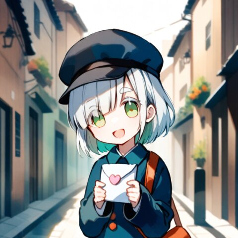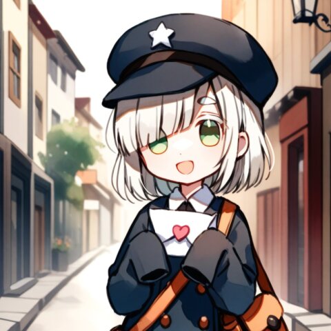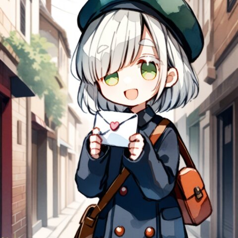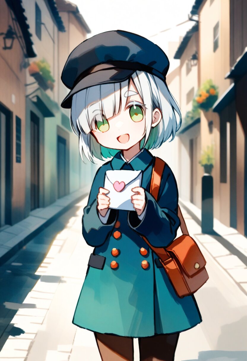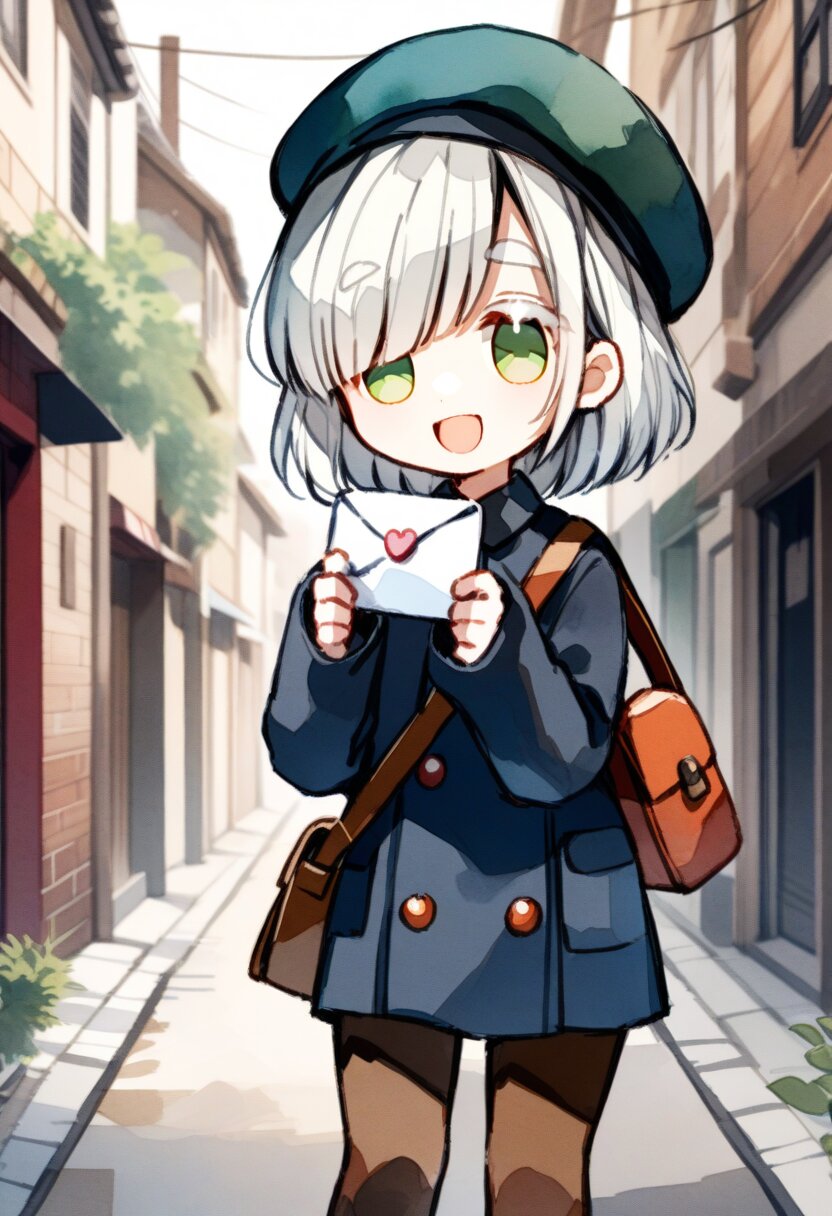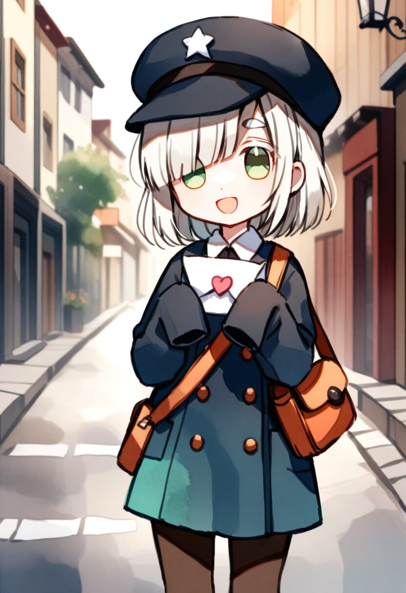 <lora:inmnstylexl:1>, best quality, masterpiece, very aesthetic, watercolor painting, general, chibi, 1girl, 10 years old, (bright white hair), short hair, blunt bangs, white thick eyebrow, white colored eyelashes, (hair over one eye), sleeves past wrists, brown tights, smile, open mouth, postman uniform, postman cap, shoulder bag, holding letter, street, mint green eyes