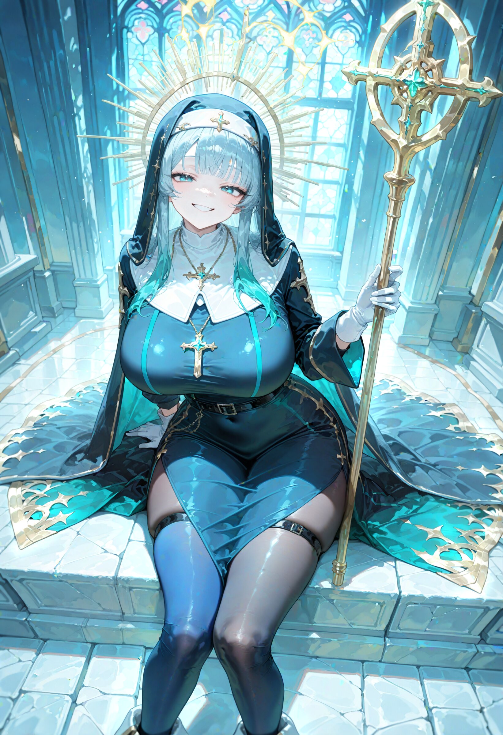 from side (close to viewer:1.2), knees out of frame (from above:1.2) , looking at viewer, 1girl, priest, beautiful detailed eyes, holy face, cool Elegant and sophisticated demeanor, (redness skin:1.0), skindentation, beautiful turquoise green eyes, , pale blue hair, burgundy colored tips, chest length hair, straight hair medium bangs , , first-rate female bodies perfect body beautiful huge breasts medium hips, (divine,Holy,goddess:1.2),, nun,coif, black cape, , religious robe, , , , belt buckle, chest belt, , white laced gloves, blue thighhighs over pantyhose, long skirt, (silk overskirt:1.0), fold-over boots, (proud smile:1.2), (seductive grin:1.4), God Light, (intricate), opulent, lustrous, holy outfit, A solemn atmosphere of piety, ascetic manner, outdoors of Saint Patrick's Cathedral, altar, stained glass, holding staff, holy light, beautiful morning, divine energy aura, upright straddle super fine concept art, hard surface, graceful eyes, different reflection, masterpiece, best quality, amazing quality, very aesthetic, absurdres you can add scenery, (volumetric lighting), To make the background more distinctive. professional art lots of details, , overexposure, shiny-glistening, (watercolor style:1.0), (pastel color style:1.0) <lora:noline (1):-0.5> <lora:sdxl2-flat2-512b:0.0> <lora:facelightup_xl_v10:0.5>