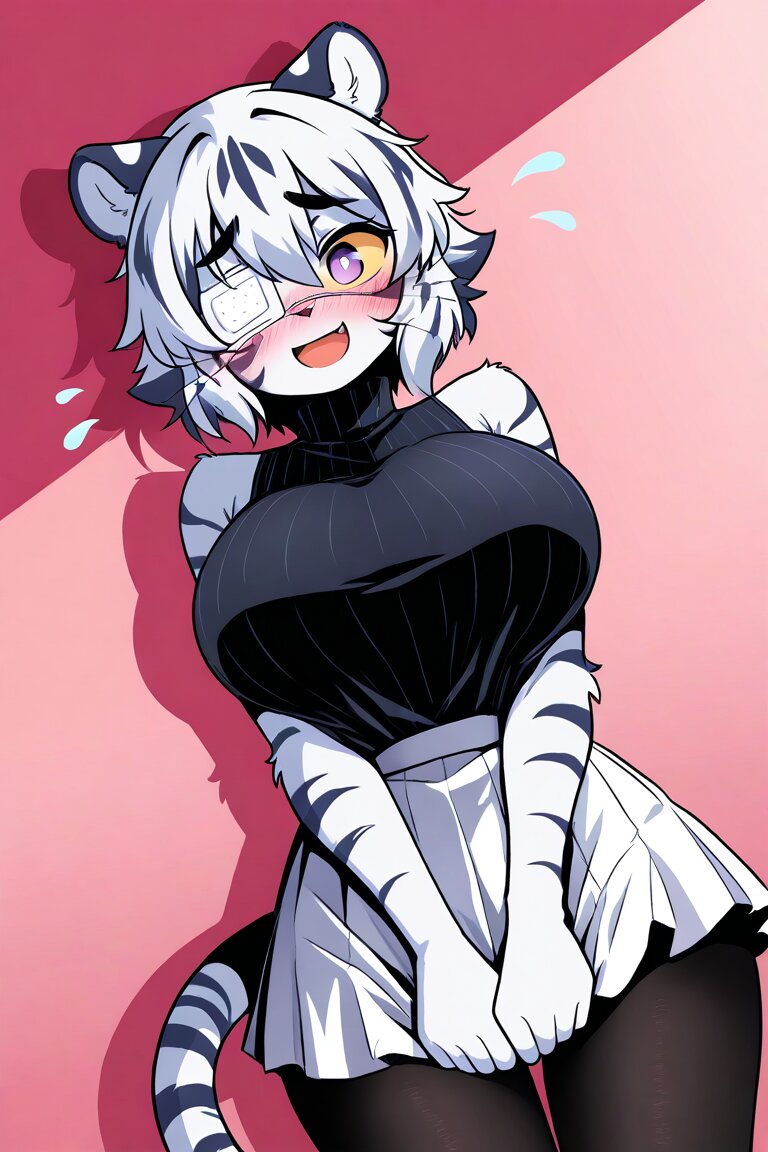 1girl,furry,white tiger girl,white tiger fur,body fur,fluffy,white tiger ears,white tiger nose,whiskers,white tiger tail,black thick eyebrows,(huge breasts),narrow waist,thick legs,silver hair,short hair,well-groomed hair,hair between eyes,purple eyes,blight pupils,colored sclera,(yellow sclera),right medical eyepatch,black turtleneck,sleeveless,ribbed turtleneck,tented turtleneck tucked in,white skirt,pleated skirt,black pantyhose,raised eyebrows,smile,blush,open mouth,standing,skirt tug,flying sweatdrops,face shade,hair shade,drop shadow,pink striped background,looking at viewer,leaning side,tilted head,dutch angle,from front,((high contrast)),( coloring),(kawaii),softy,(2D),(cute), ((hands_focus, perfect_hands:1.5)),furry,(two tone fur),(furry body),perfect body,detailed face,high quality,cute clothes,animal tail,animal ears,solo,big breasts,masterpiece,highly detailed, ultra-sharp, 8K resolution,((correct_anatomy)),fine fabric emphasis,no lines, simple style, vibrant colors, good light, paint style,anime,gddw