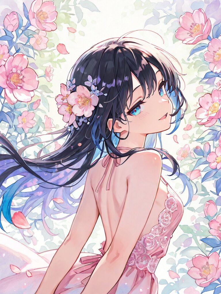 masterpiece, best quality, ultra-detailed, unity 8K wallpaper, illustration, traditional media, watercolor painting, vibrant colors, deep colors, 1girl, black long hair, pink lace backless dress, floral hair ornament, seductive smile, open her mouth, standing,arms behind back, floating petal, colorful flowers, surrounded by flowers, flowers background, flowers arrangement, looking at viewer, upper body, from side, cinematic angle,