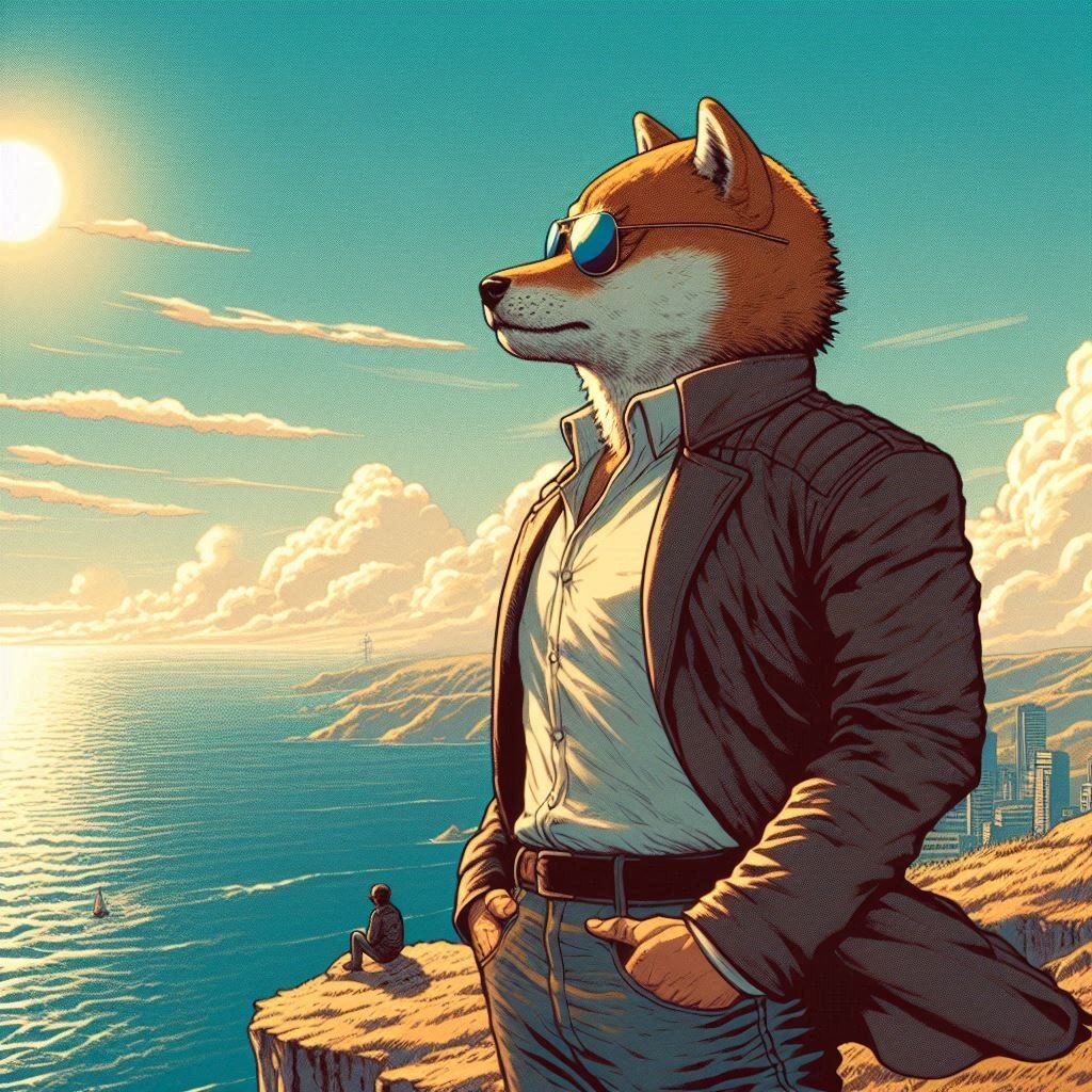 映画のポスターの様なイラスト。映画のラストシーンの様なダイナミックな構図と情景。オフィシャルアート。 日本のアニメの画風のセミリアルな渋いキャラ。柴犬を擬人化したマッチョな老人。彼はサングラスをかけ初夏の日差しが指す中、崖の上に立ち大海原を眺めている。