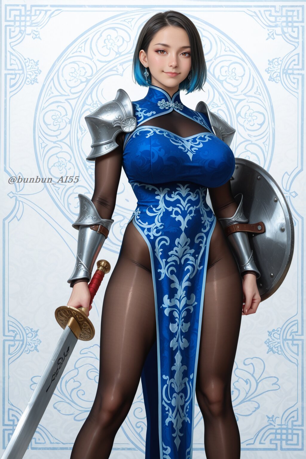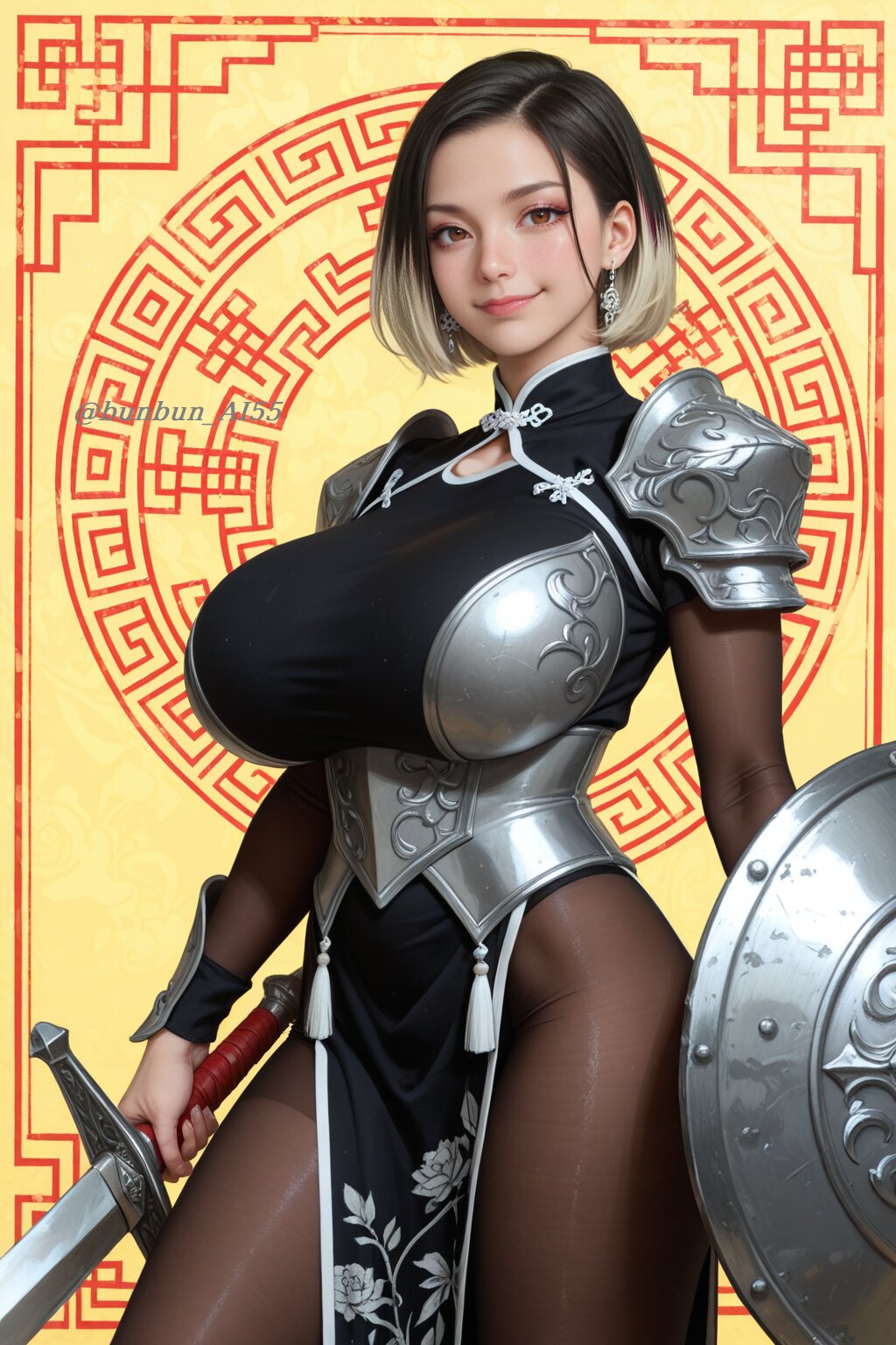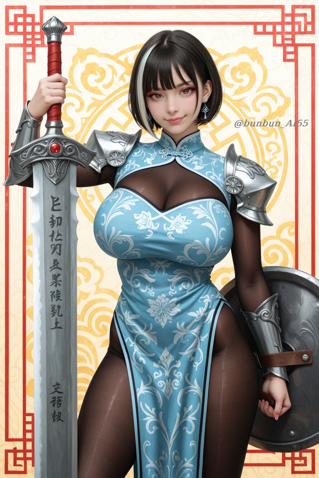 HDR, 8K,masterpiece, best_quality, amazing quality, very aesthetic, absurdres, newest, detailed eyes, realistic eyes, realistic body,(realistic, hyperrealistic), highres, movie style, fantasy art, fantasy aesthetics, BREAK perfect lighting, professional lighting, dynamic lighting, (1girl, beautiful female knight, 18year old), (kawaii, idol), (slim face, small face, cute face, detailed face, brown eyes, makeup), (looking at viewer, confident smirk), (silver and black two-tone hair, short hair), (jewelry, piercing, earrings), nsfw, (huge breasts, pointy breasts), long legs, (perfect hands), (shiny skin), (athletic body), (wearing a fantasy-style wearing sheer bodystocking underneath a Chinese qipao dress, no pants), ((flayered with elegant fantasy armor, ornate armor details)), (light reflections), (shiny, glossy, luster), (standing, legs apart, elegant and powerful pose), (holding a gigantic longsword in one hand and a large metal shield in the other:1.2, holding large metal shield, intricate ornate details), (heroic pose, battle-ready), (detailed background, chinese pattern background), (from side | straight-on), (bust-up shot:1.2, medium shot:1.2, dynamic angle, dutch angle),