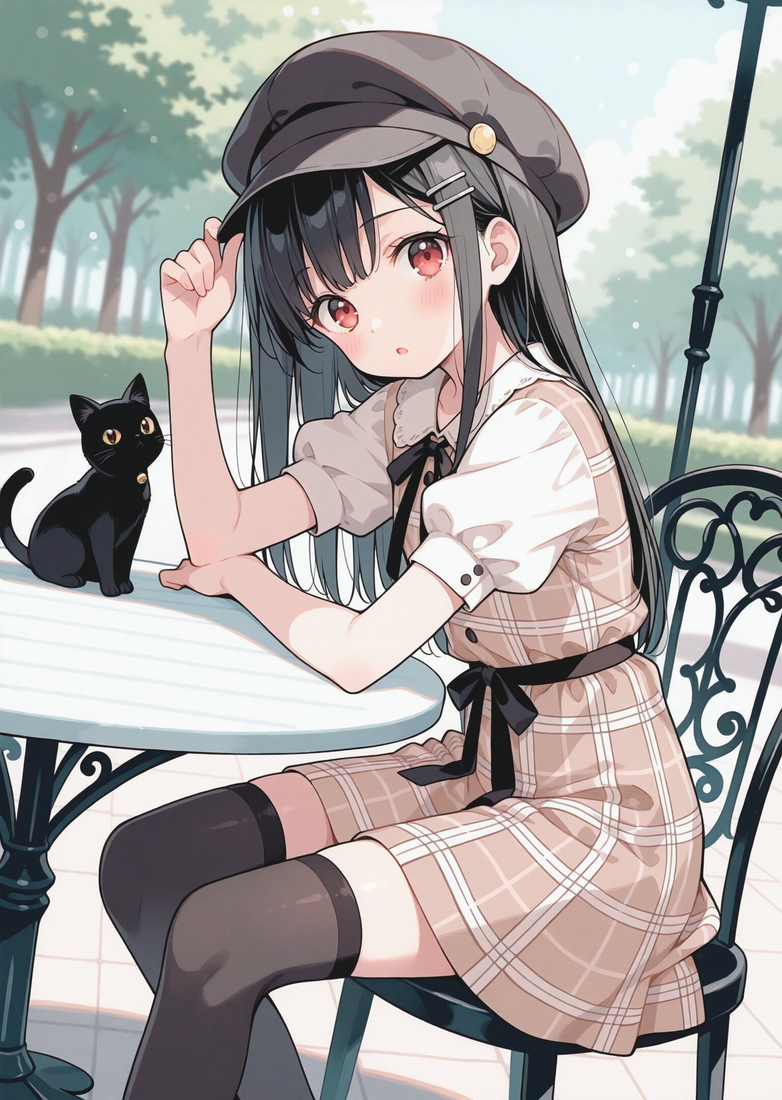 (flat color:0.1),(pale color:0.15), (tareme:0.33), cute 1girl is sitting on chair , (red eyes:0.0), straight hair ,black hair ,(hair between eyes:0.4), hairpin,kawaii, (pastel theme :0.3), (depth of field:0.7), (bokeh:0.5),(open mouth :0.5),(excited:0.1) ,(:D:0.2),(:o:0.4), (head tilt:0.7), BREAK (black cat on table:1.2), (yellow eyes:1.2), outdoors, terrace table, chairs, hat tip pose,black_headwear , plaid dress, brown dress, short sleeves, refined , black_legwear, thighhighs, ribbon, puffy short sleeves, white sleeves, street , ( from side:0.1), ( dutch angle:0.2),(contrapposto:0.9)