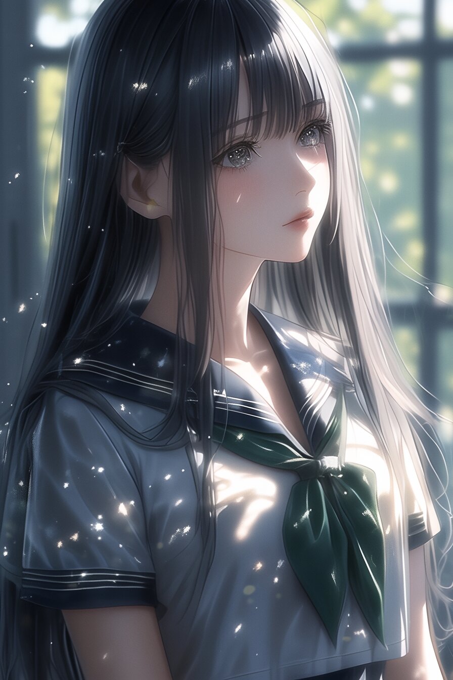 Beautiful girl, dark green sailor uniform with dark green collar, short sleeves, small smile, long black straight hair, clear skin,
