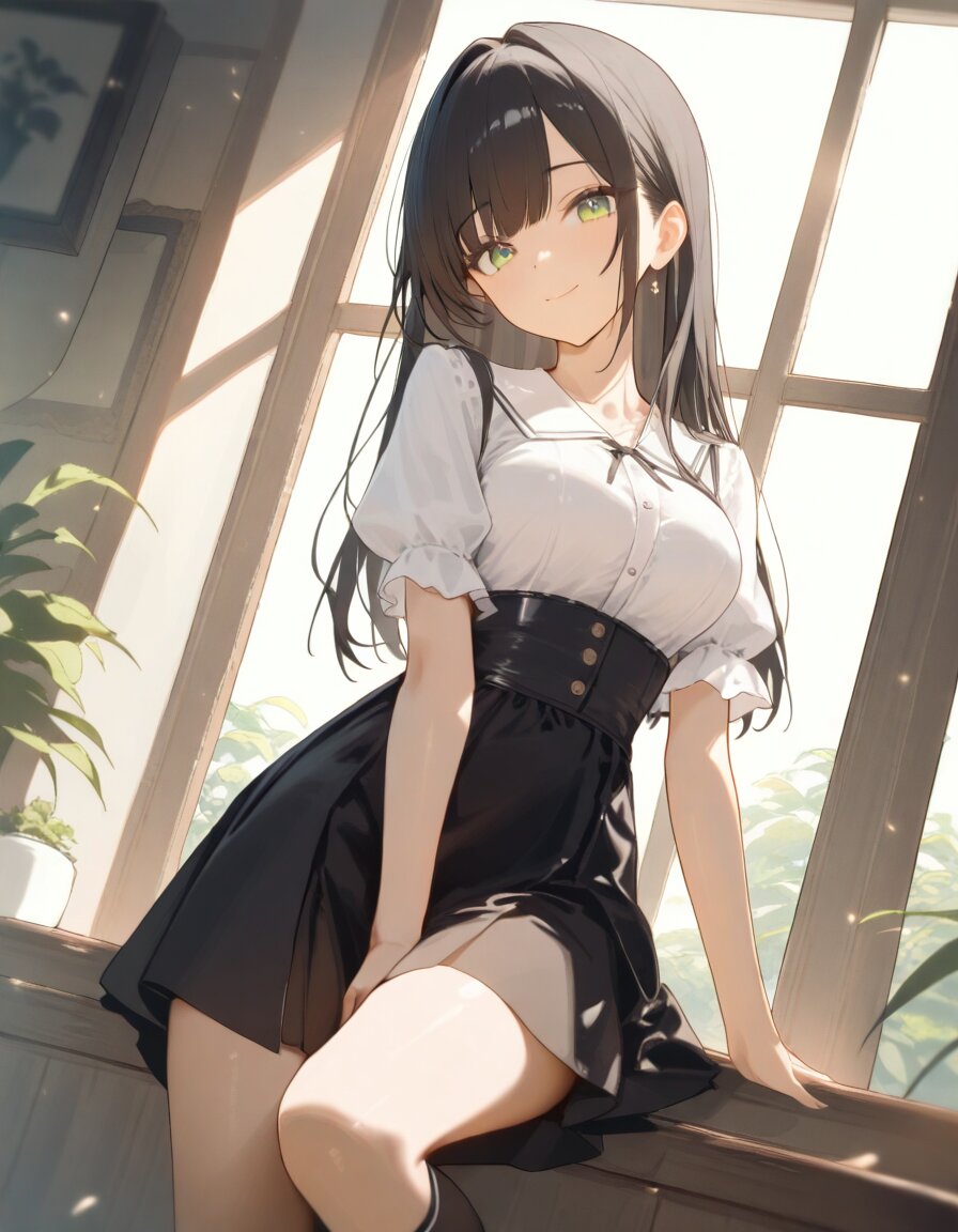 1girl, solo, smile, black hair, long hair, straight hair, green eyes, medium breasts, blouse, high-waist skirt, black high socks, smooth skin, soft sunlight through windows, intimate atmosphere, masterpiece, high score, great score, absurdres, cowboy shot, looking at viewer